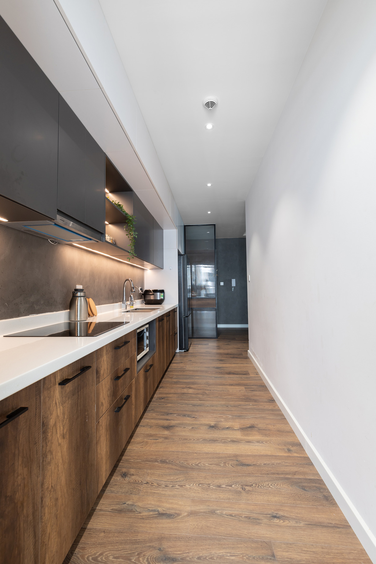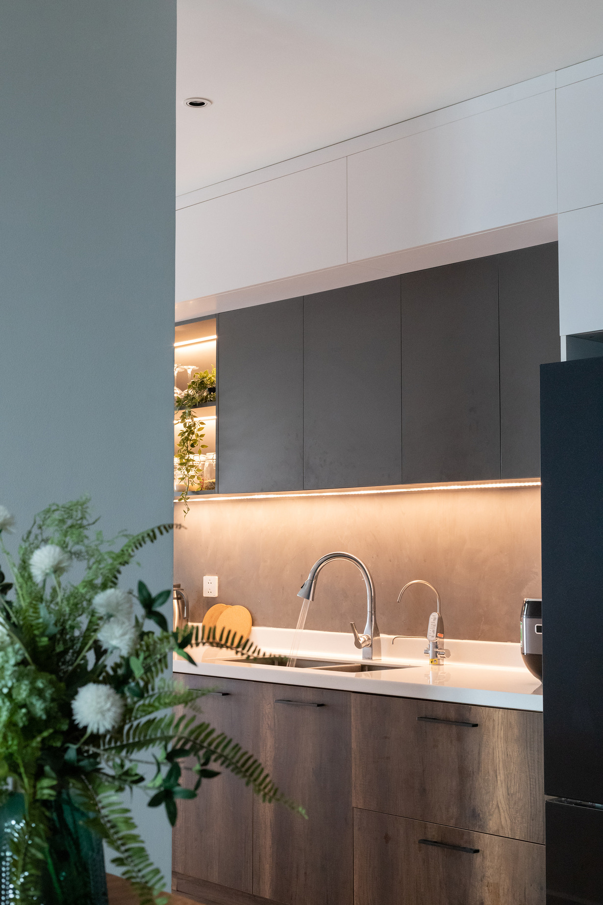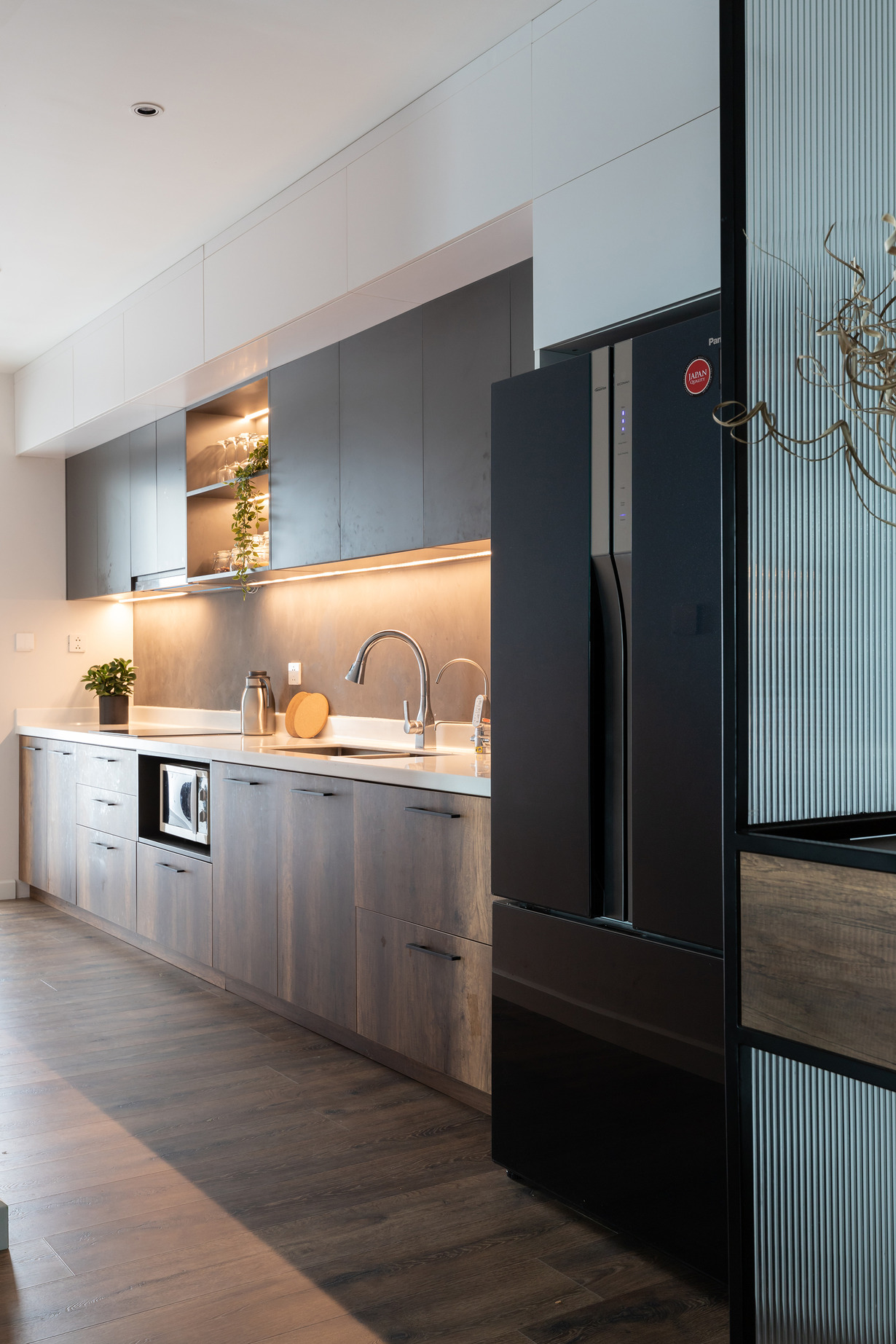 Góc bếp ấm cúng và hiện đại khi có sự liên kết màu sắc với phòng khách từ gỗ đến bức tường bếp.