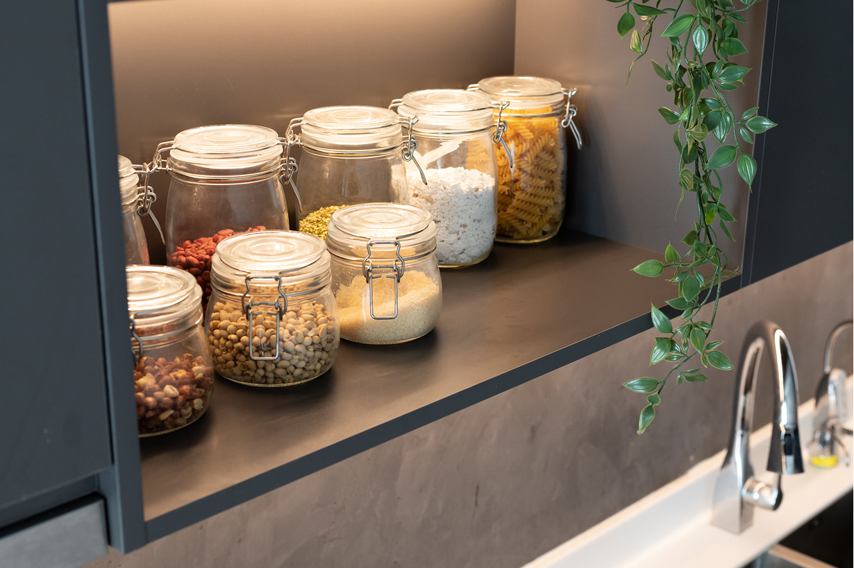 Một góc đặt lọ gia vị và cây nhựa trang trí trên hộc tủ.