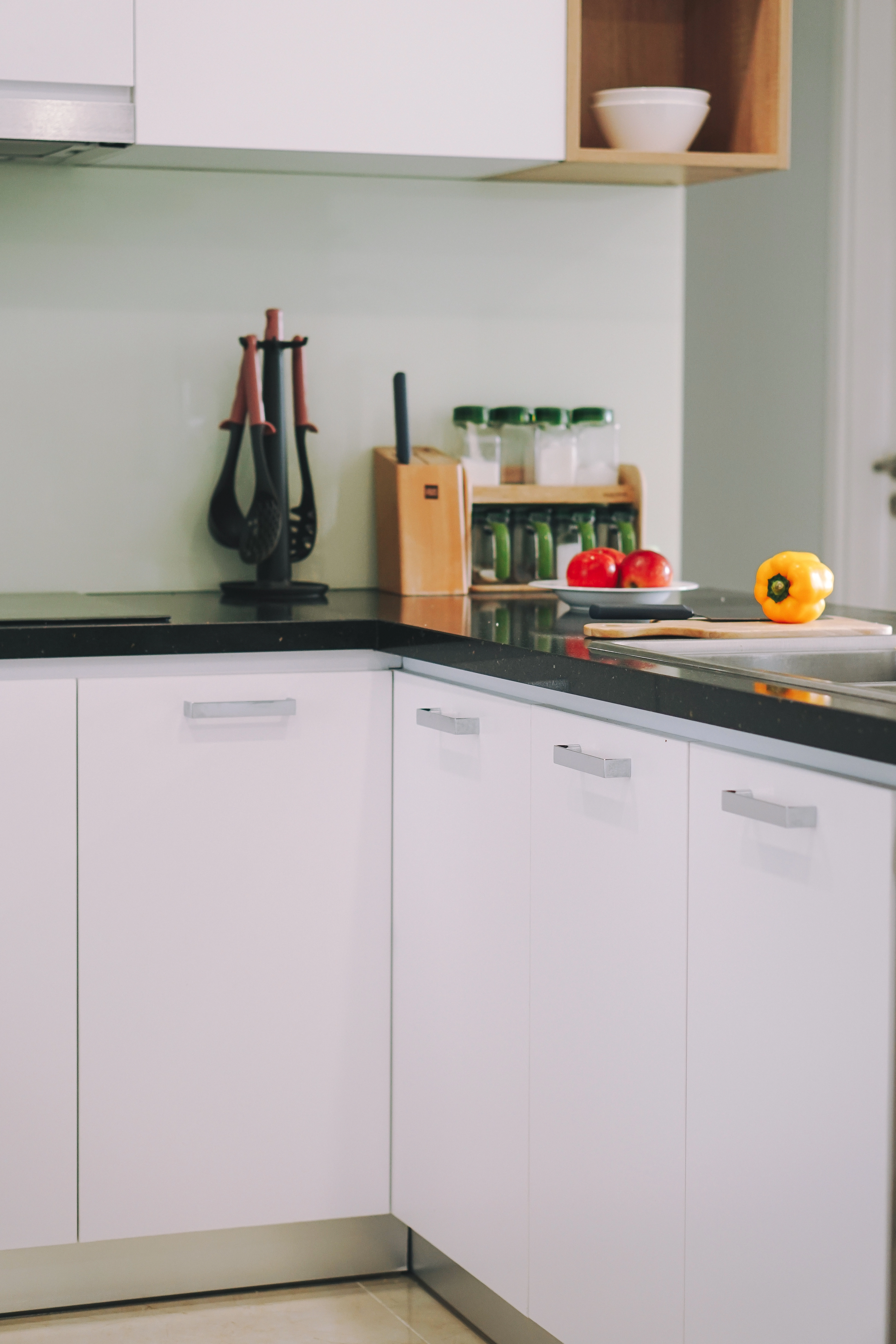 Phòng bếp thông với phòng khách có hệ tủ bếp màu trắng kết hợp vân gỗ mang lại sự ấm áp, tinh tế. Không gian sinh hoạt chung cuốn hút với những điểm nhấn như một vài bức tranh trang trí, thảm, đèn decor đem lại vẻ đẹp khác biệt cho căn hộ. Do diện tích bếp không rộng nên chủ nhà đầu tư tủ bếp hiện đại giúp giấu đồ tối đa, tạo sự gọn gàng.