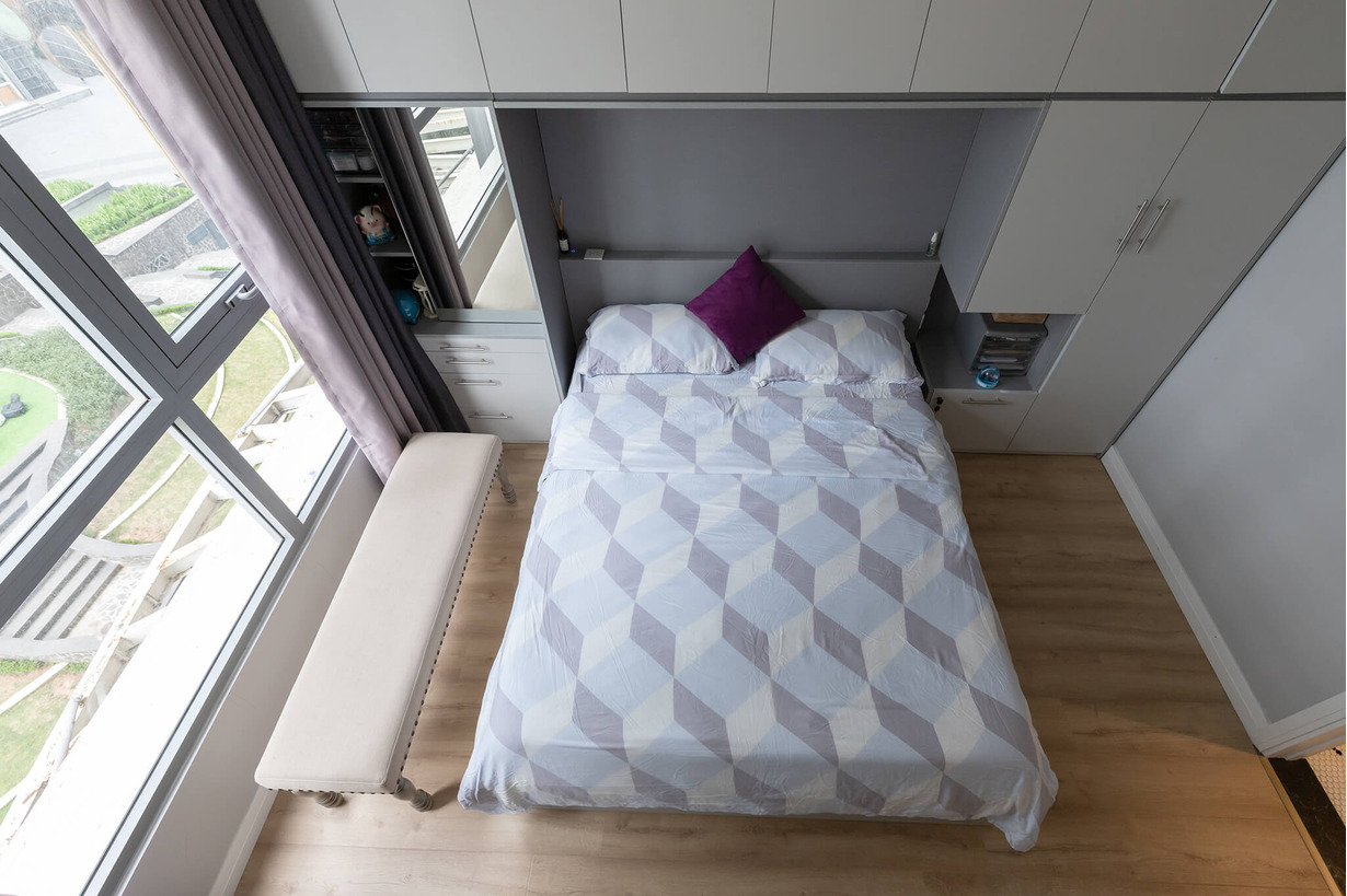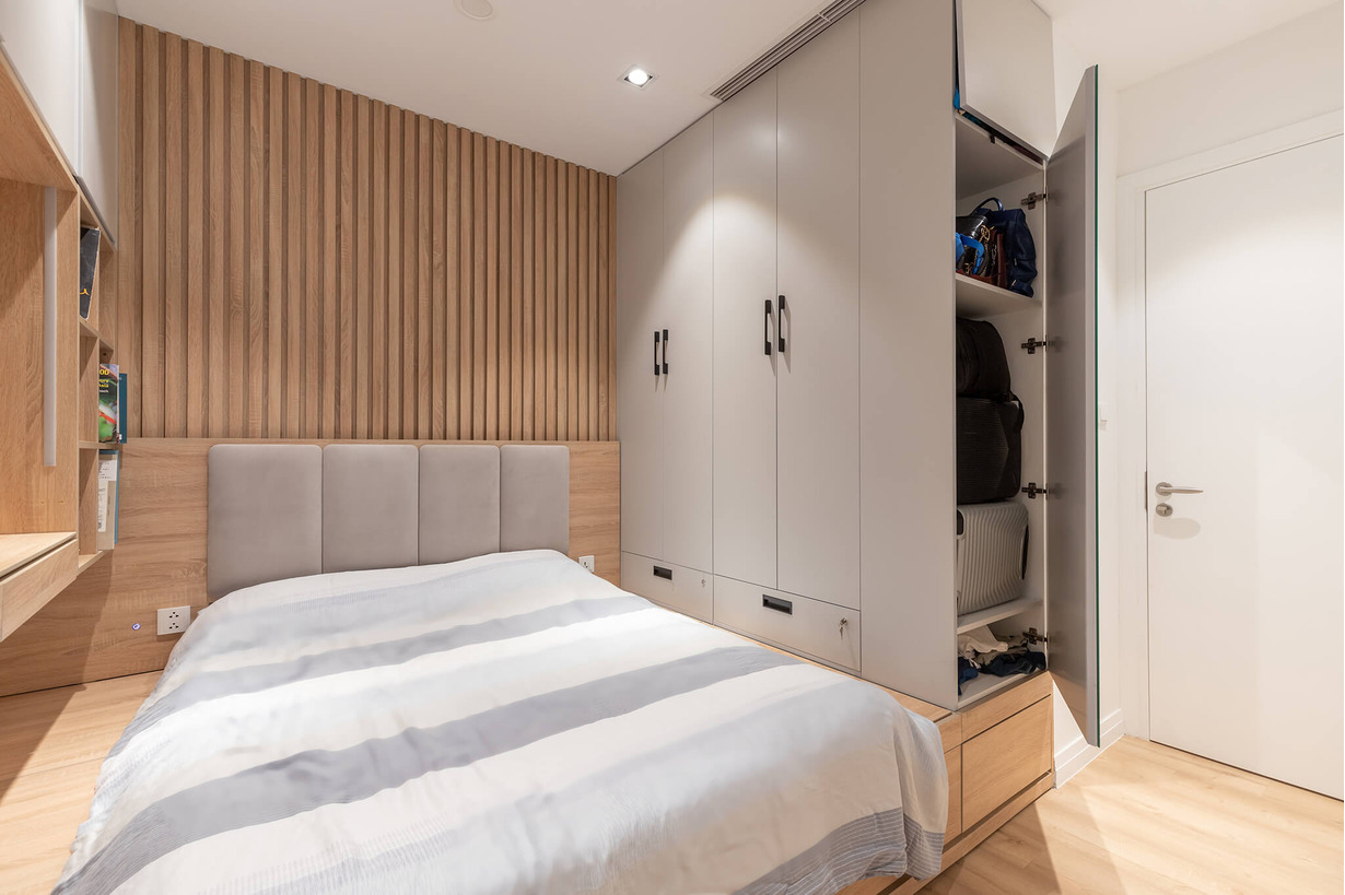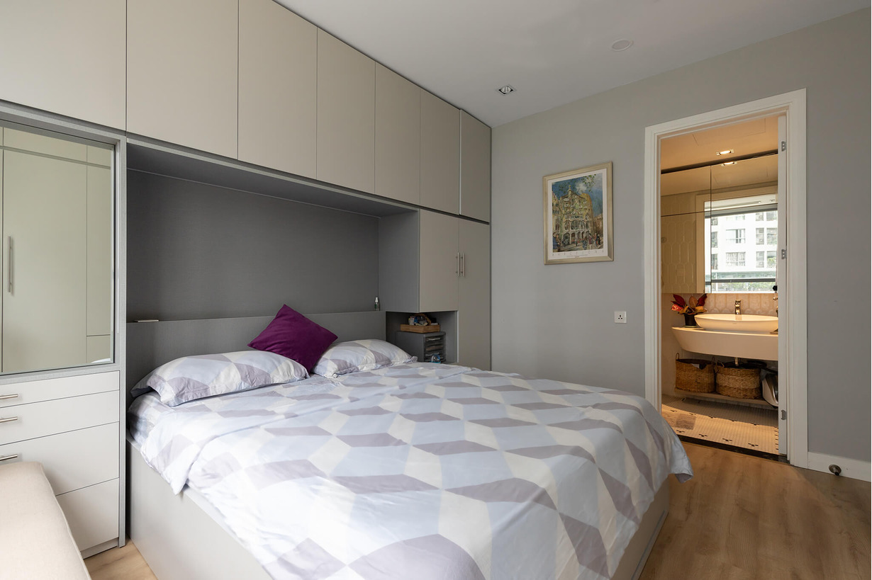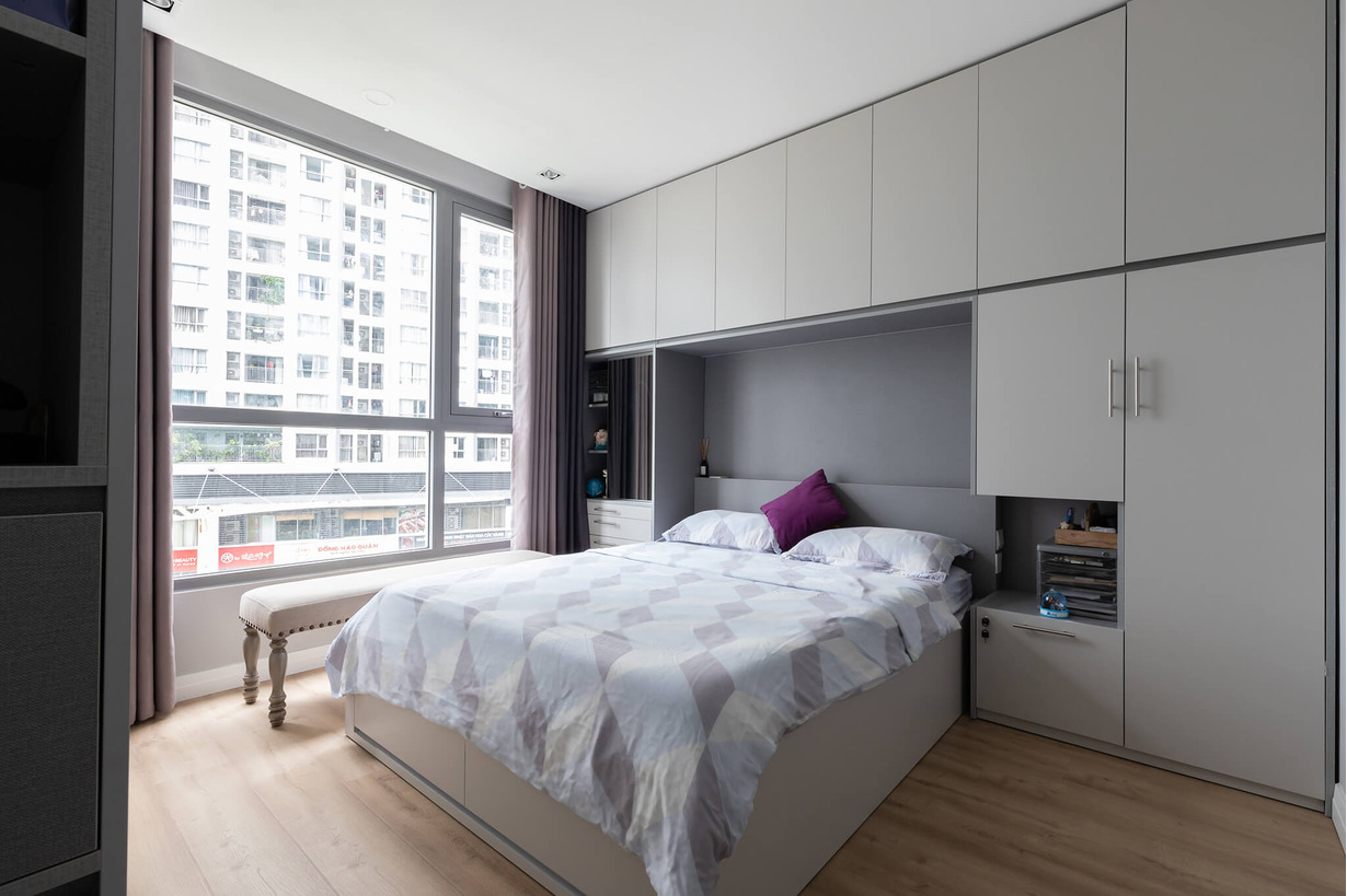 Hai phòng ngủ đều được decor khá đơn giản, ưu tiên sự kết hợp giữa màu ghi với màu trung tính để tạo sự gọn gàng và yên tĩnh cho mọi người khi nghỉ ngơi. Flexfit đã tối ưu hóa không gian bằng cách sử dụng bằng hệ thống tủ âm tường.