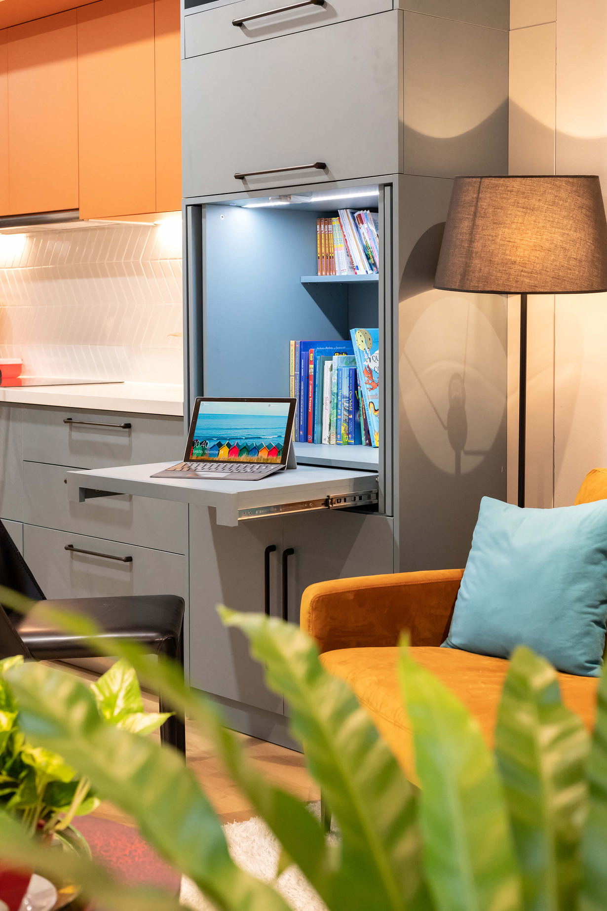 Bên cạnh đó, những công năng cần có cho một căn bếp hiện đại được bố trí đầy đủ như bếp từ, lò nướng, máy hút mùi, hệ đèn LED, máy rửa bát. Hệ tủ cũng được nhấn nhá một cách tinh tế bằng cách kết hợp màu ghi với điểm nhấn màu cam. Góc nhỏ đẹp hiện đại và đủ đầy khiến bất kỳ ai ghé thăm nhà chị đều yêu thích.