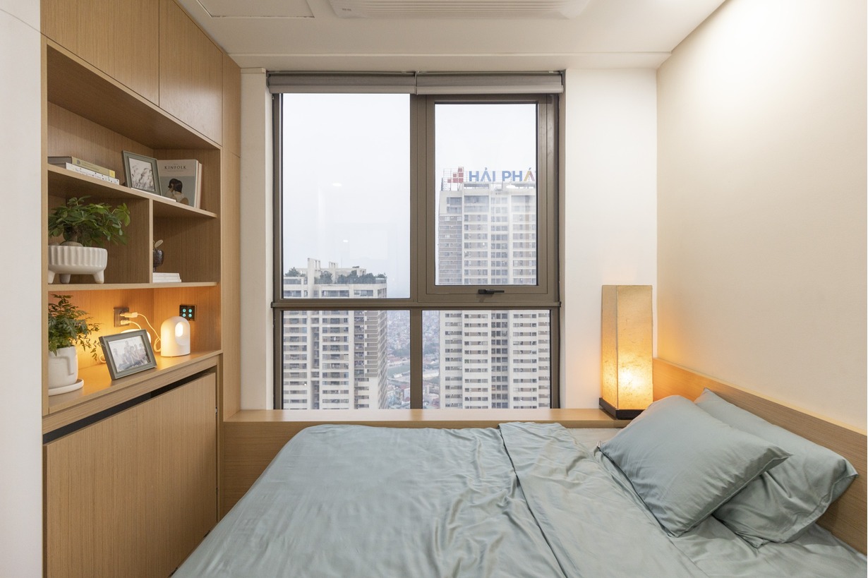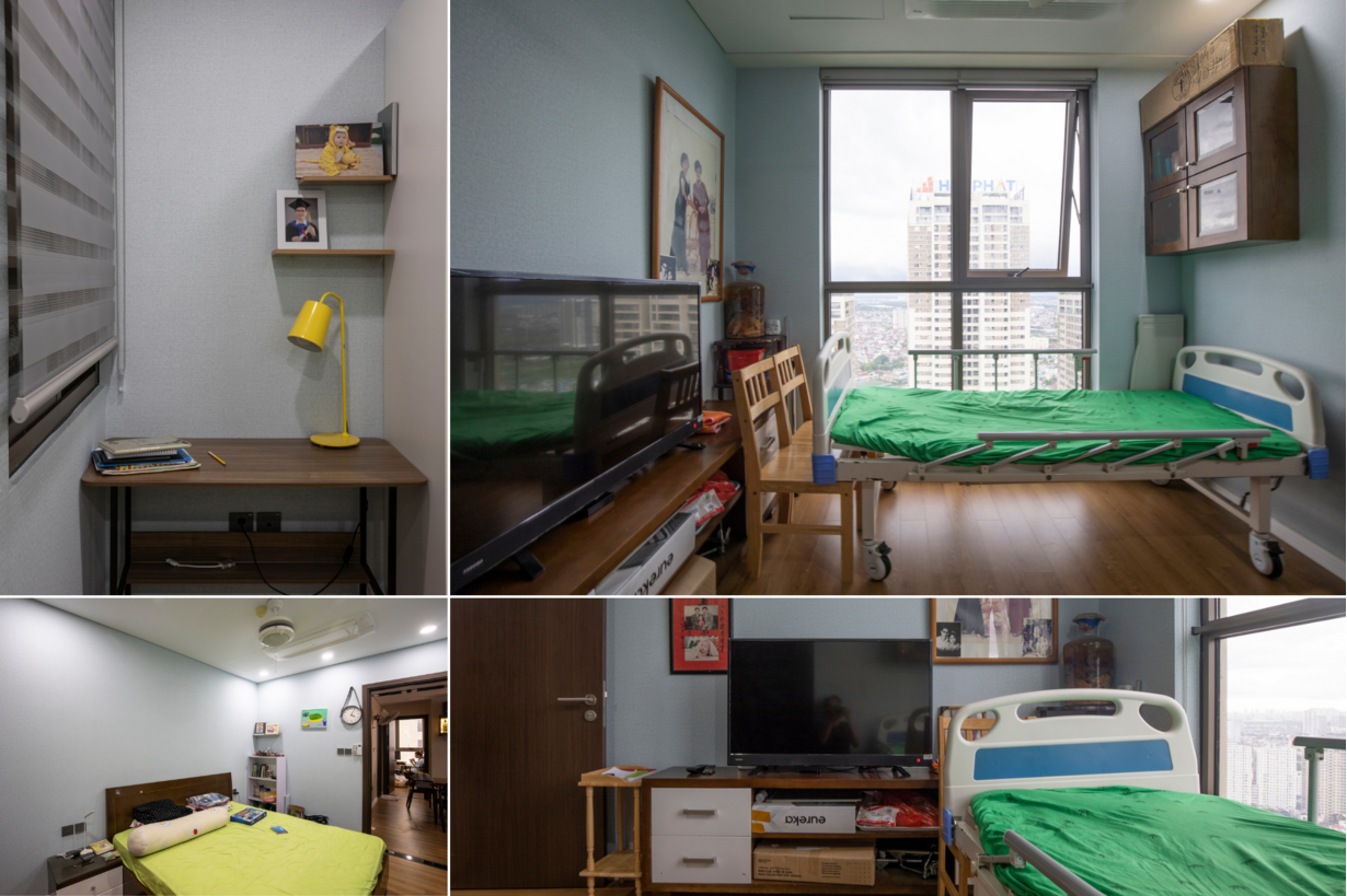 Phòng ngủ mới được tối đa hóa công năng, không gian mới tạo cảm giác gọn gàng, thoáng đãng. Gam màu chủ đạo là màu xanh trầm trung tính, màu gỗ tự nhiên khiến căn phòng trở nên ấm áp,mang đến sự bình yên, thoải mái sẽ giúp cho người bệnh có tâm trạng tốt hơn. Bên cạnh đó, những chậu cây xanh cũng được khéo léo đưa vào tạo một không gian sống gần gũi với thiên nhiên, tạo cảm giác dễ chịu cho cả người bệnh và người chăm sóc.