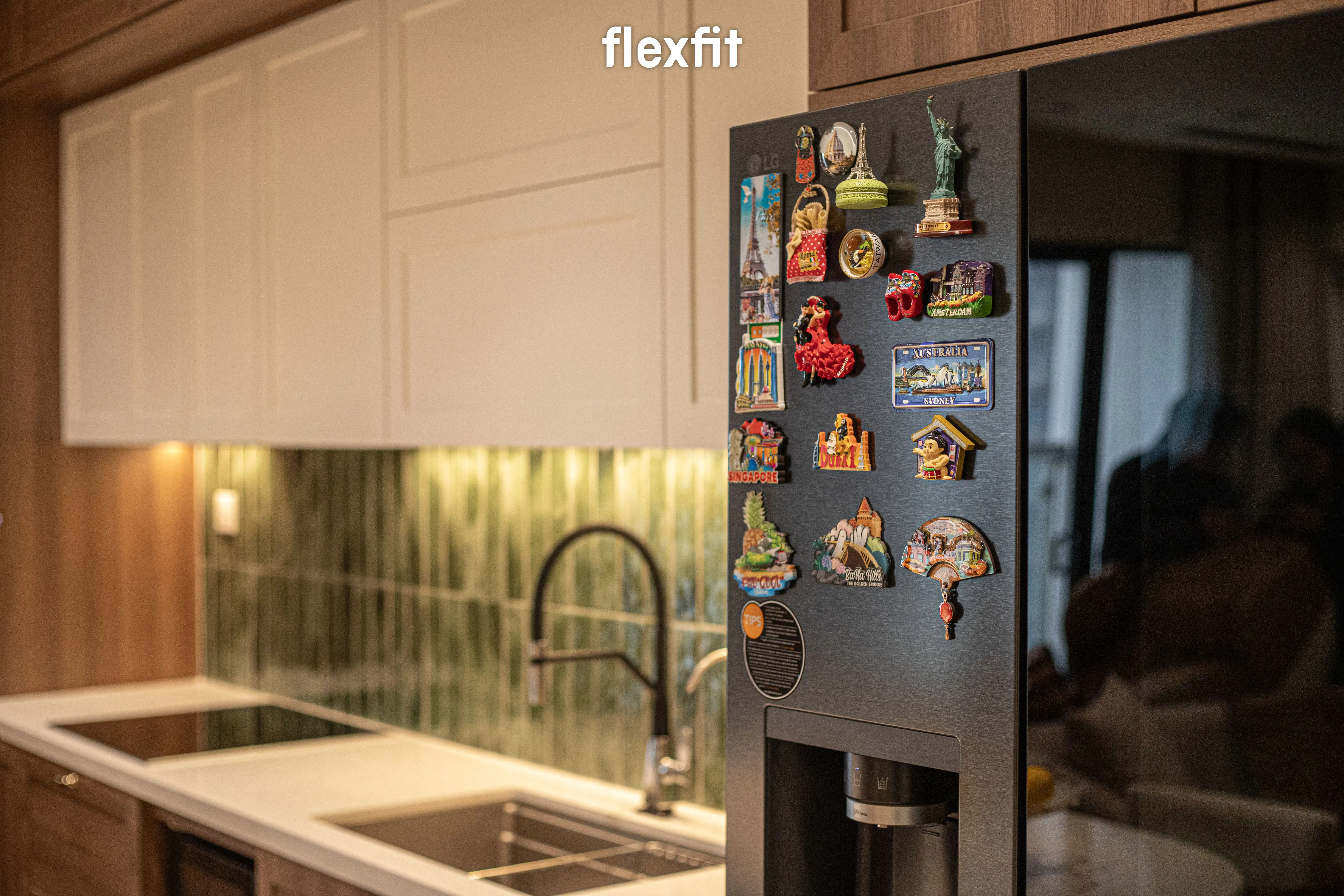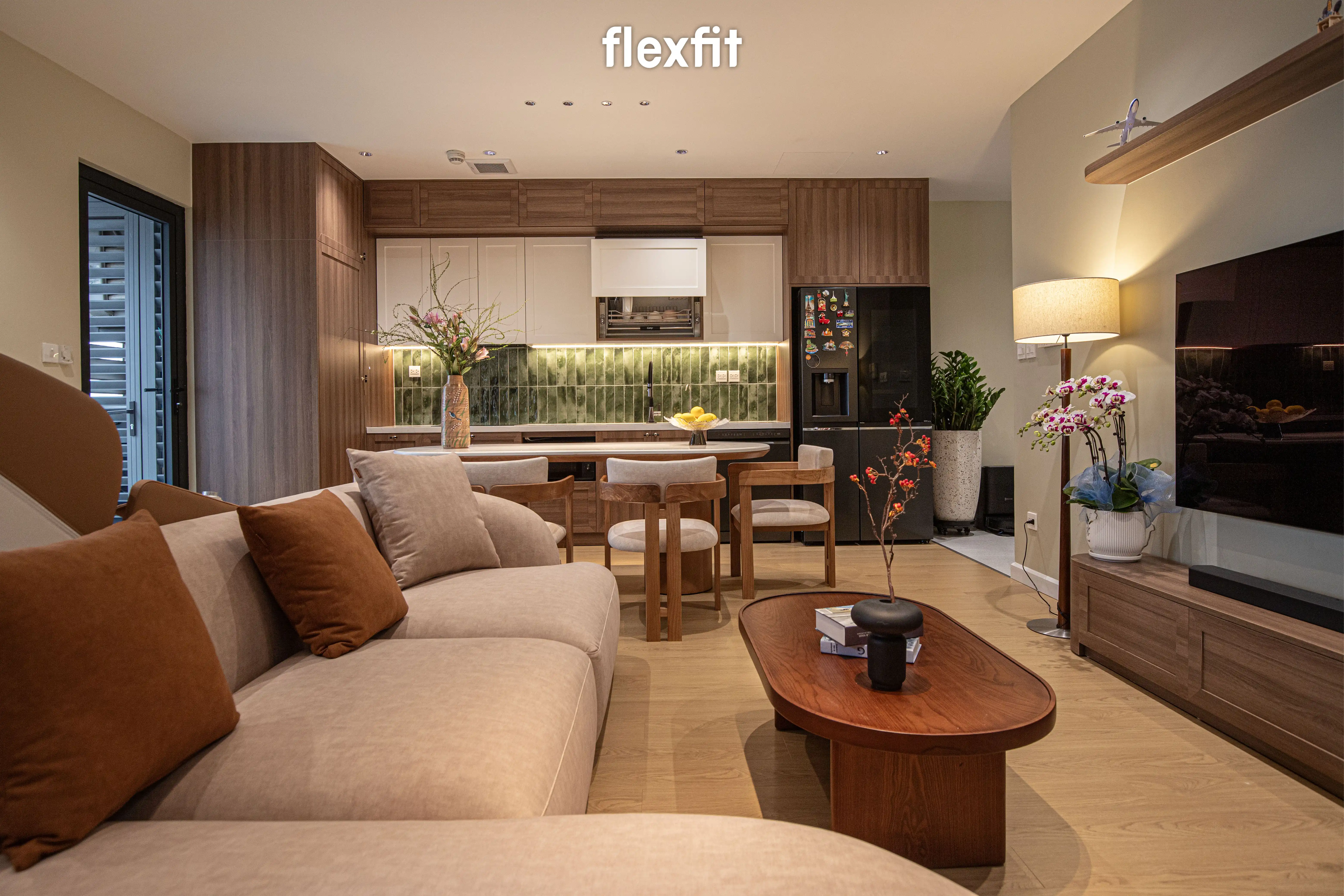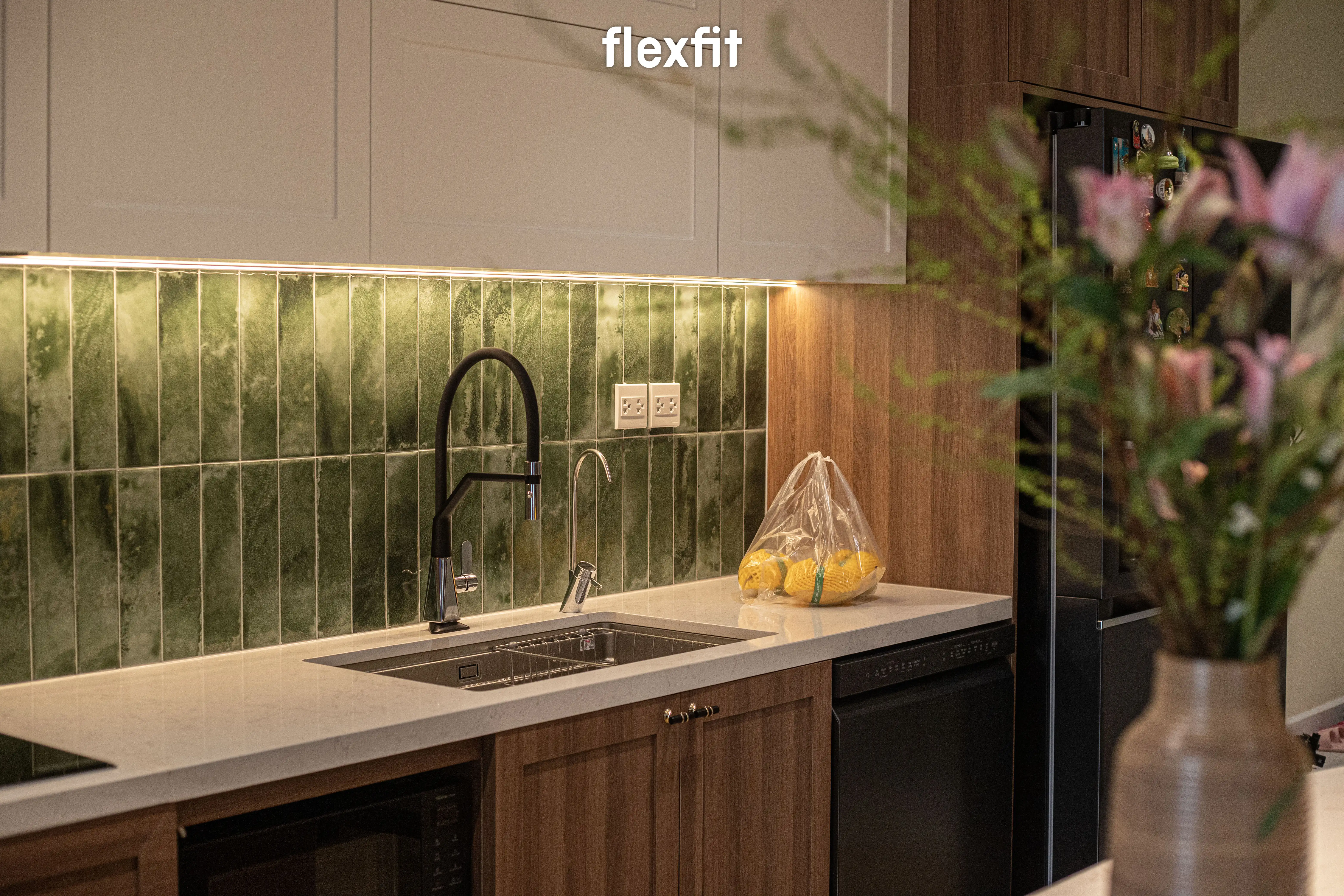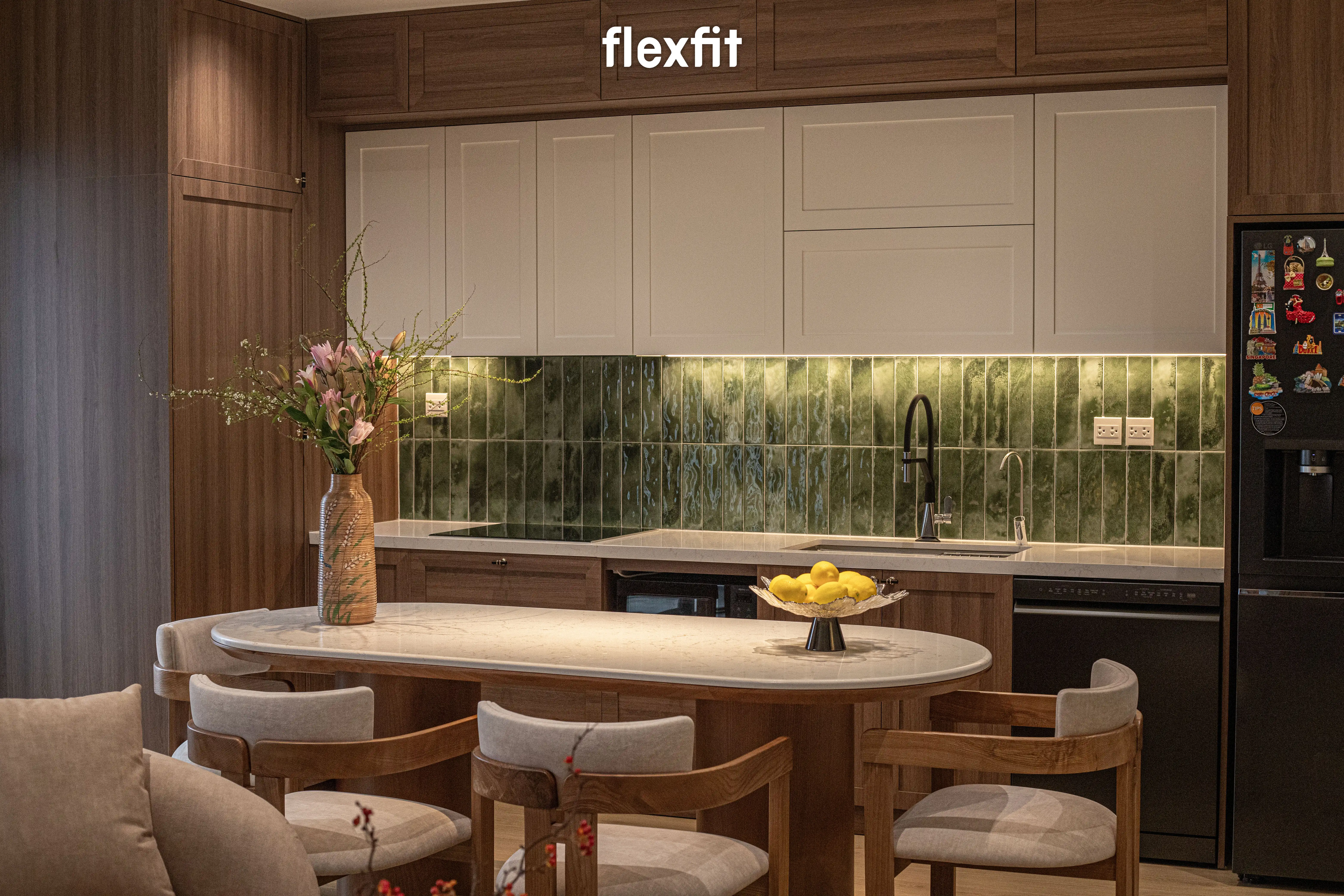 Bếp & Bàn Ăn Điểm nhấn thị giác ấn tượng với mảng tường gạch thẻ màu xanh rêu (Green Moss) mộc mạc, dịu mát. Chiếc bàn ăn hình tròn xoá nhoà khoảng cách, là nơi cả gia đình ba thế hệ quây quần bên những bữa cơm lành do chính tay Bà và Mẹ chuẩn bị, vun đắp tình thân từ những điều giản dị nhất.