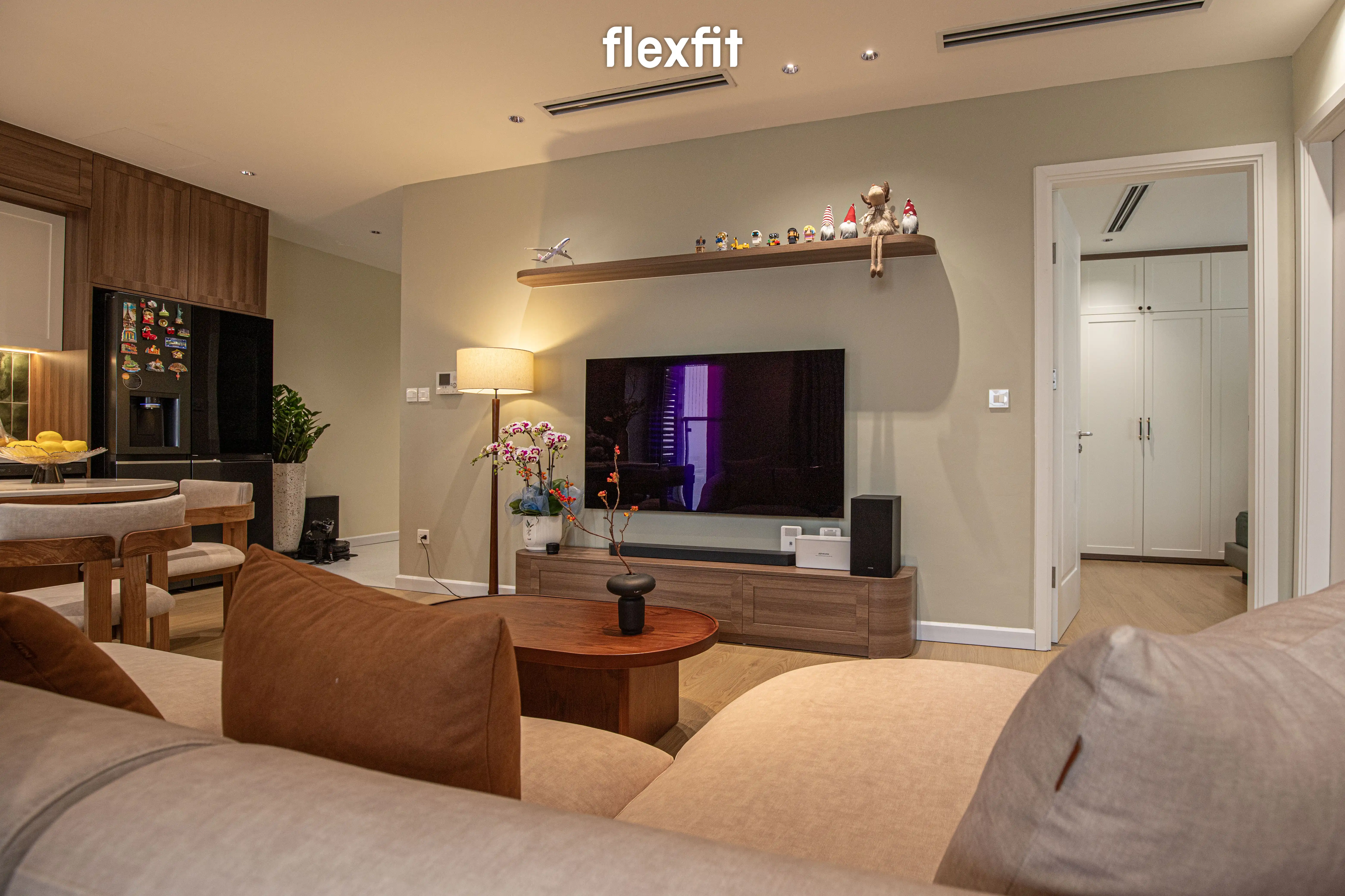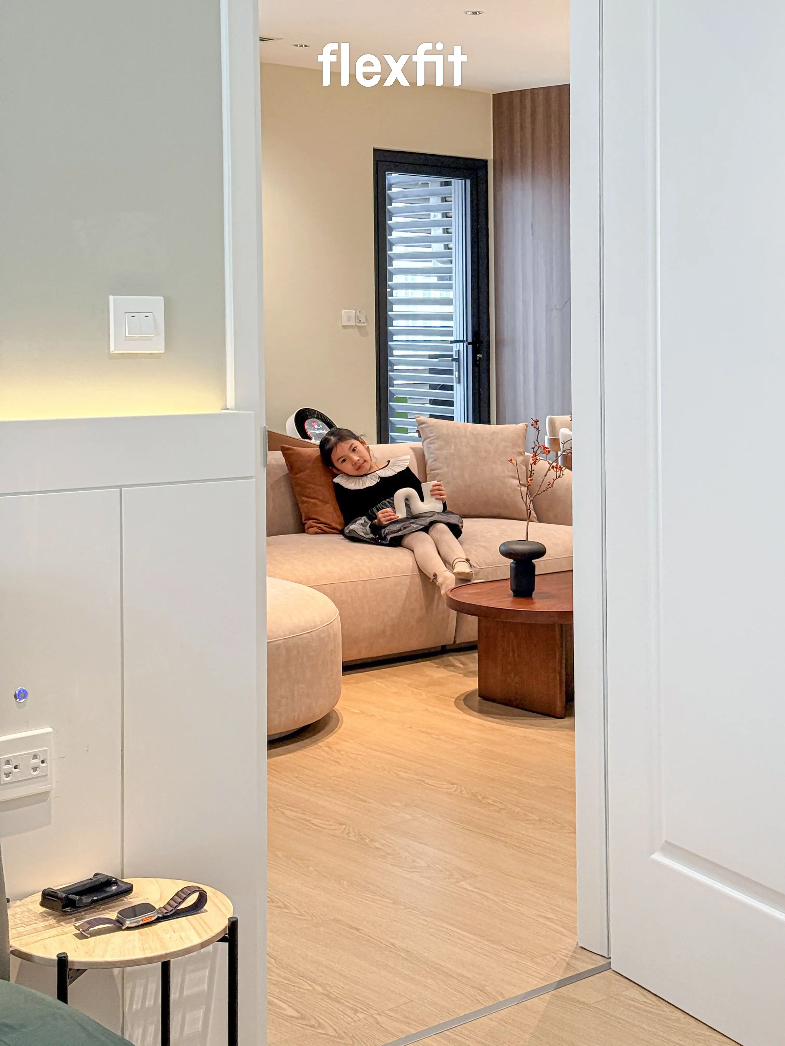 Phòng Khách Trung tâm của sự vỗ về với những đường cong mềm mại từ vòm cửa, trần nhà đến chiếc sofa bọc nỉ êm ái. Không gian loại bỏ hoàn toàn các góc nhọn, tạo ra một sân chơi an toàn tuyệt đối để Bơ thỏa sức chạy nhảy, nô đùa mà bố mẹ không phải lo lắng về những va chạm.