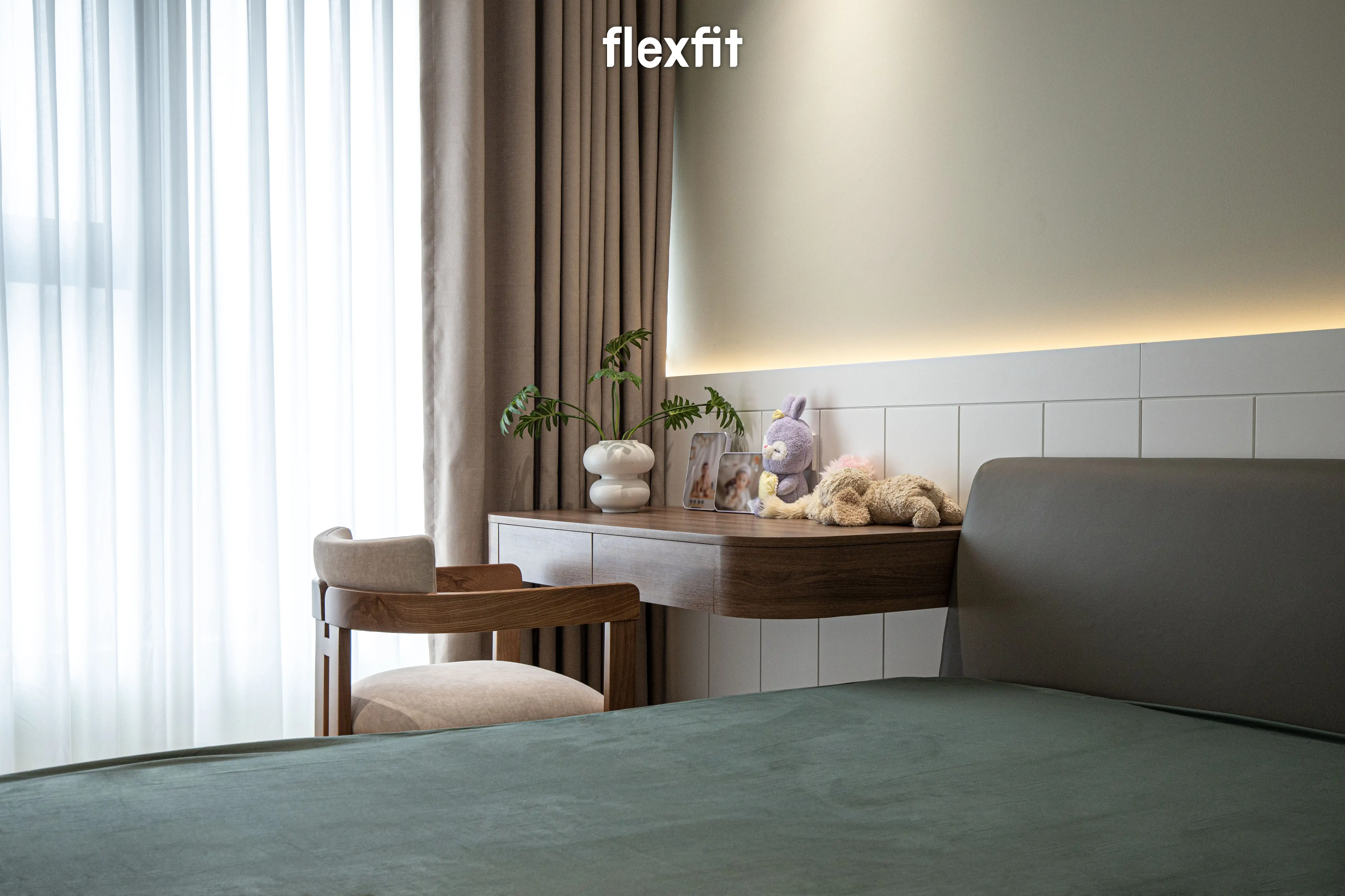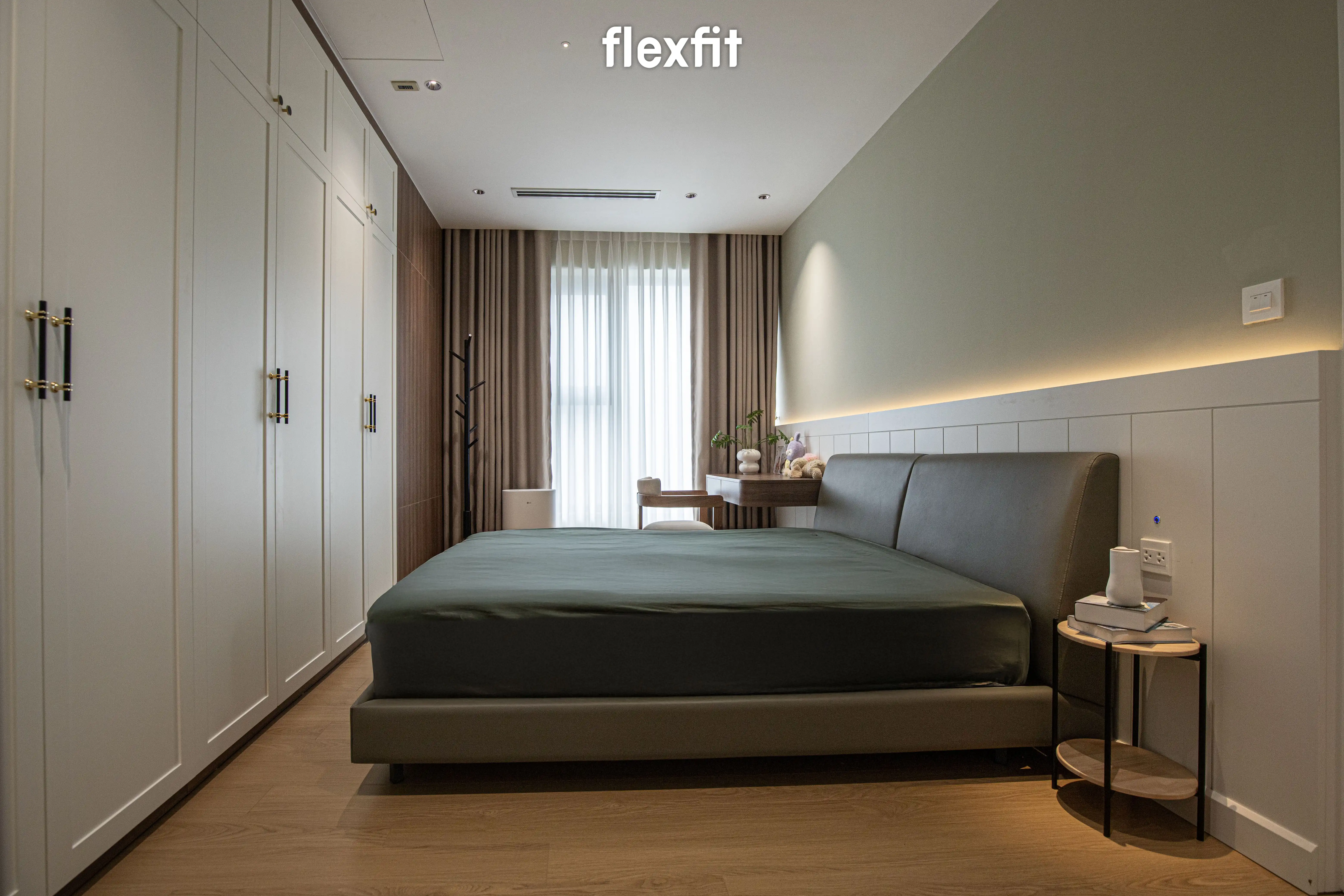 Phòng Ngủ Master Cảm giác được thiên nhiên ôm ấp ngay trong giấc ngủ. Mảng tường đầu giường màu xanh lá dịu mát đóng vai trò như một liệu pháp tinh thần, xua tan mọi mệt mỏi cho Bố Mẹ. Điểm nhấn độc đáo nằm ở thiết kế hộc sáng đầu giường chạy dọc một dải ánh sáng vàng ấm áp, êm dịu thay thế hoàn toàn ánh đèn gay gắt, vừa tiện dụng vừa vỗ về giấc ngủ an nhiên