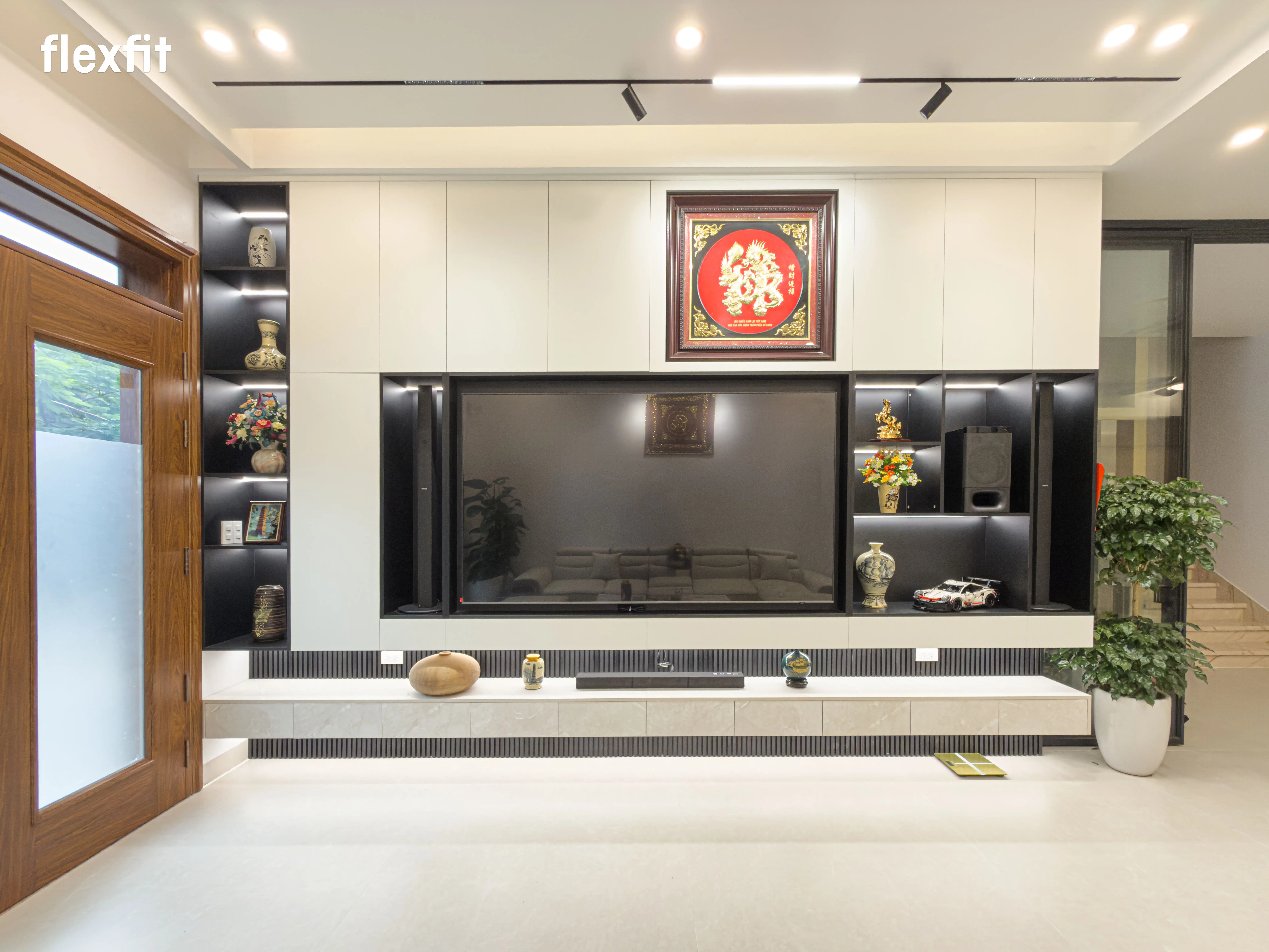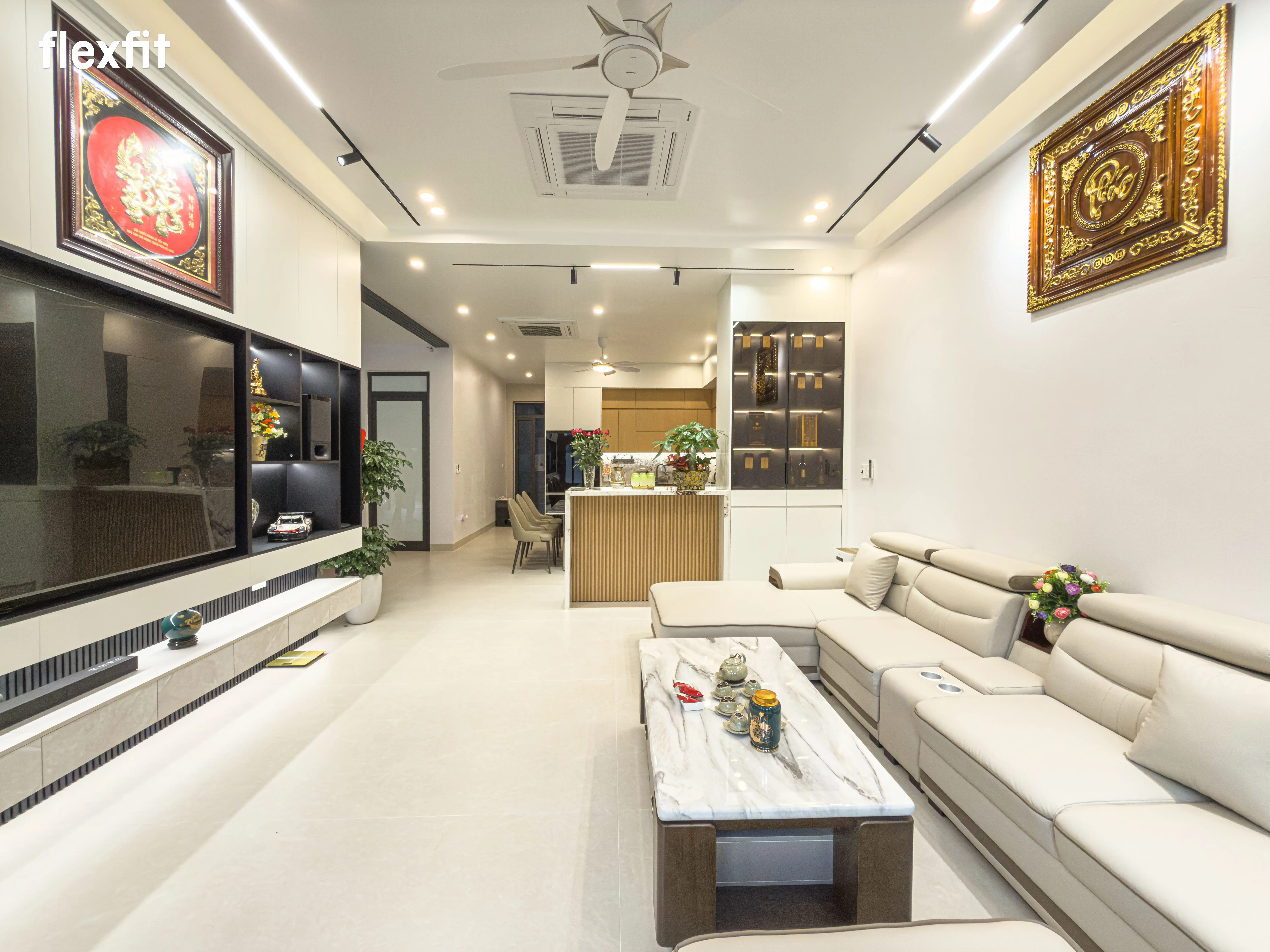 2. Phòng Khách Tuyên ngôn của sự thành đạt. Tâm điểm là bộ sofa da kích thước lớn, thể hiện sự hiếu khách hào sảng. Vách tivi ốp đá vân mây khổ lớn tạo chiều sâu và sự mát lạnh, sang trọng cho cả không gian.