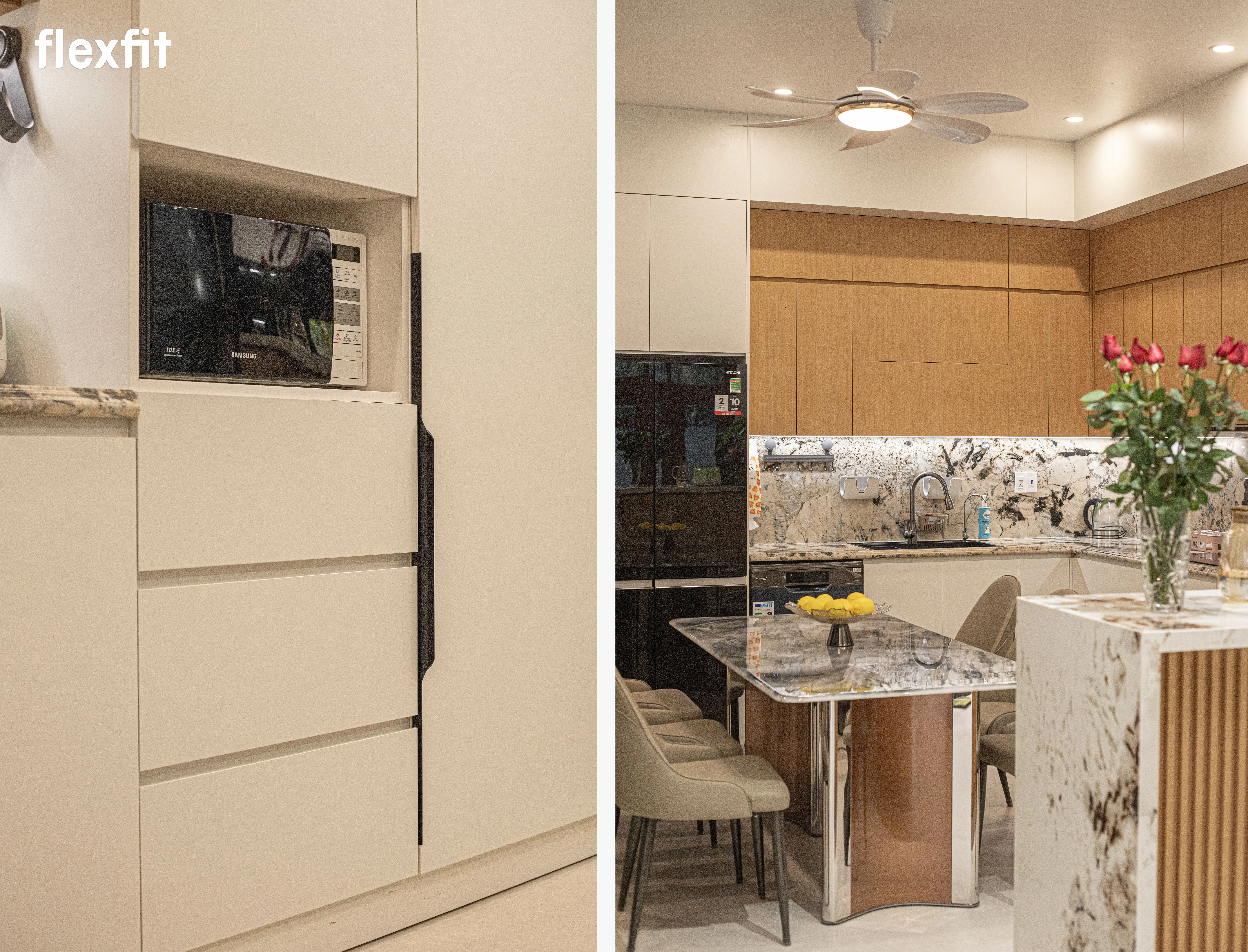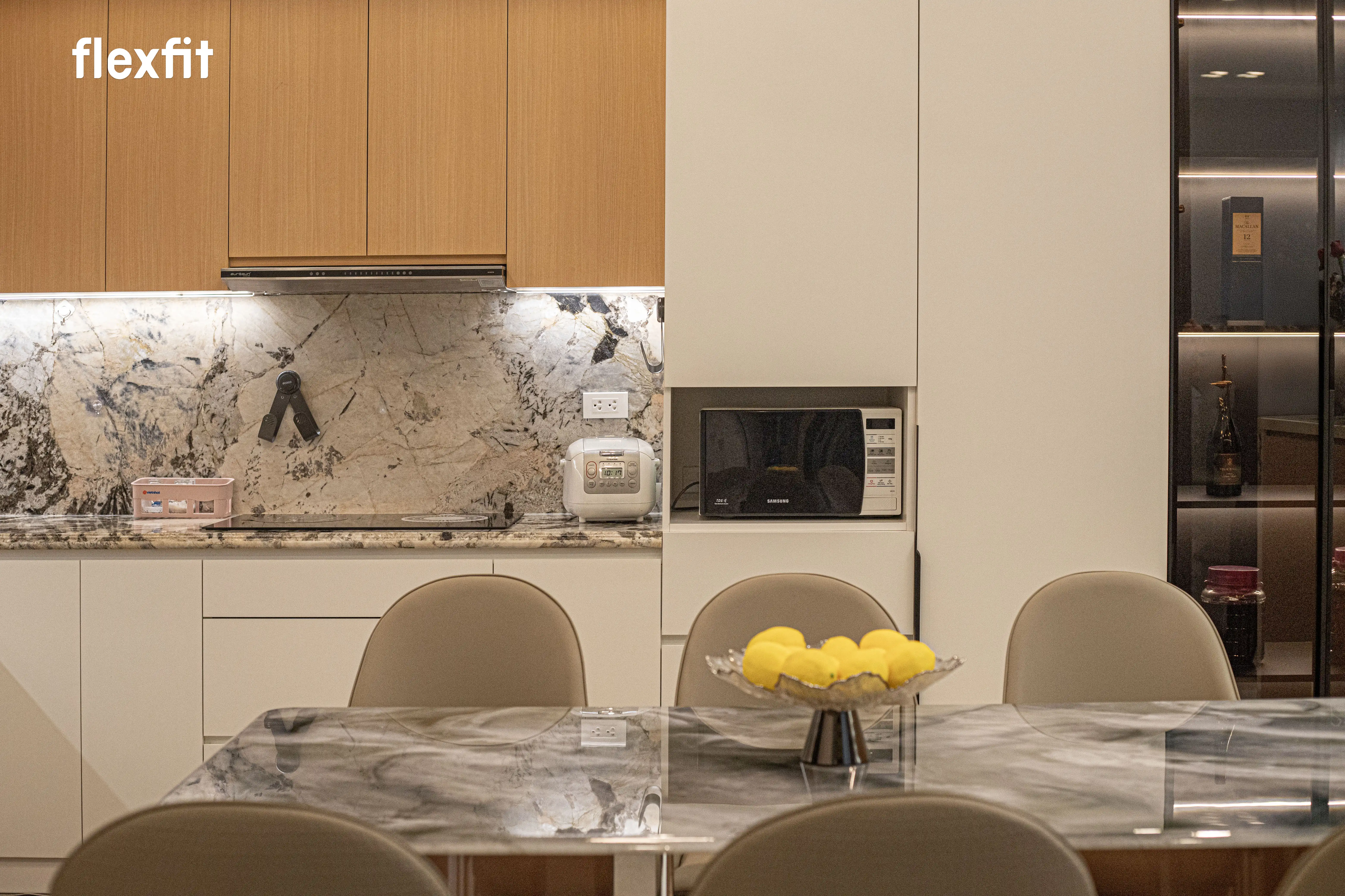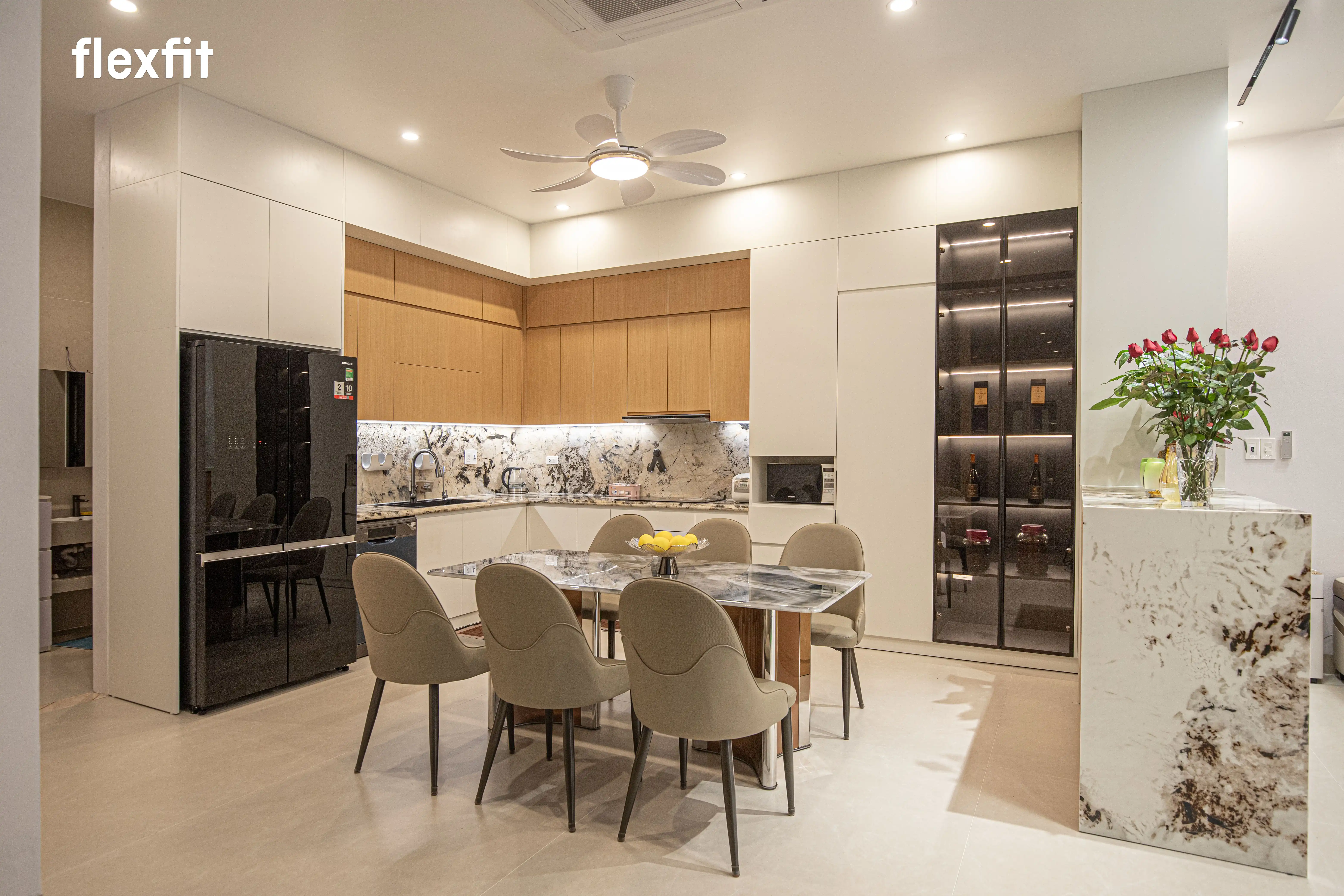 Hiện đại và bóng bẩy. Hệ tủ bếp kịch trần giúp nới rộng không gian và dễ dàng vệ sinh. Bàn đảo kết hợp bàn ăn mặt đá liền khối, tạo nên một khu vực sinh hoạt chung đẳng cấp và tiện nghi.