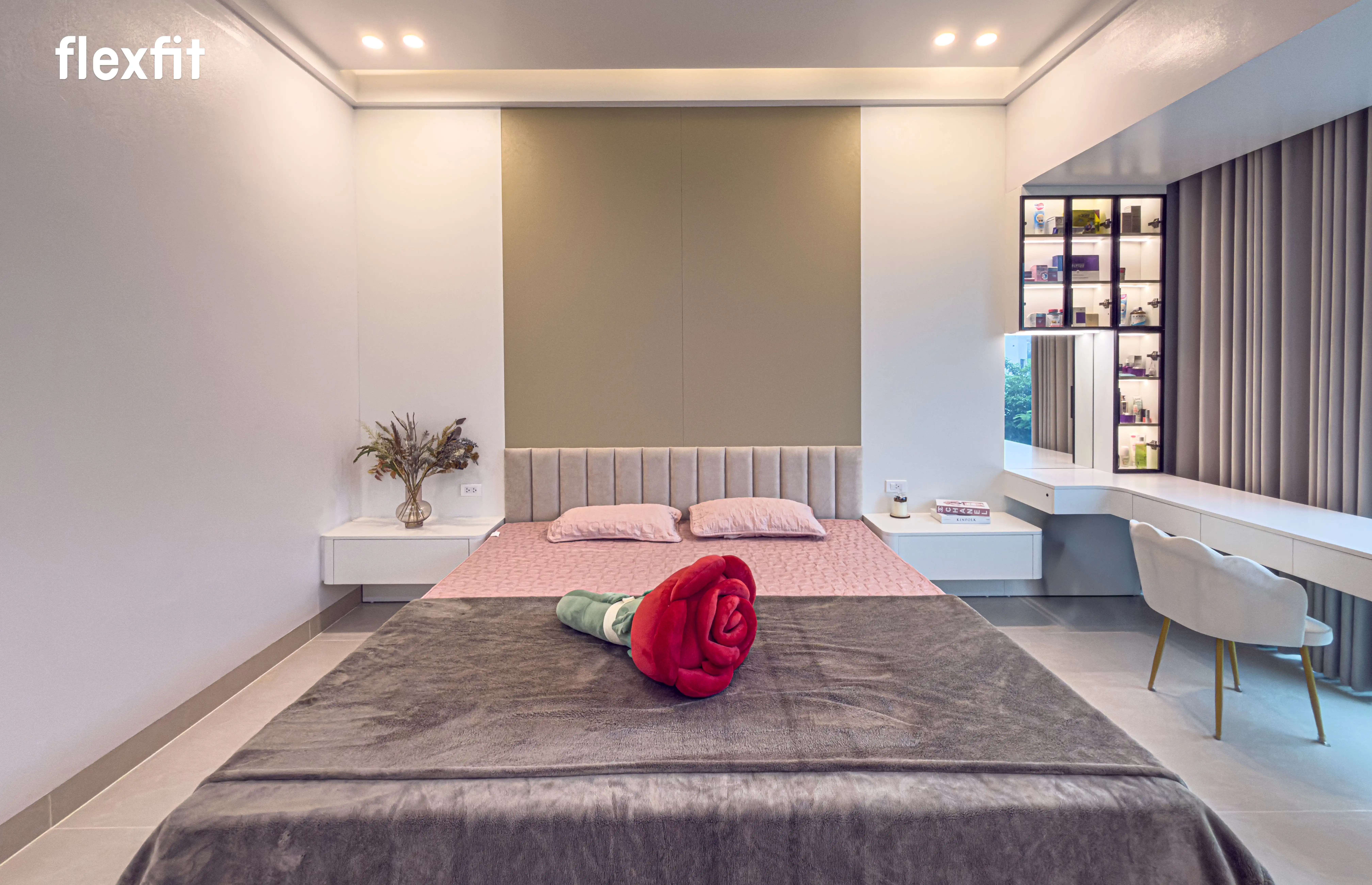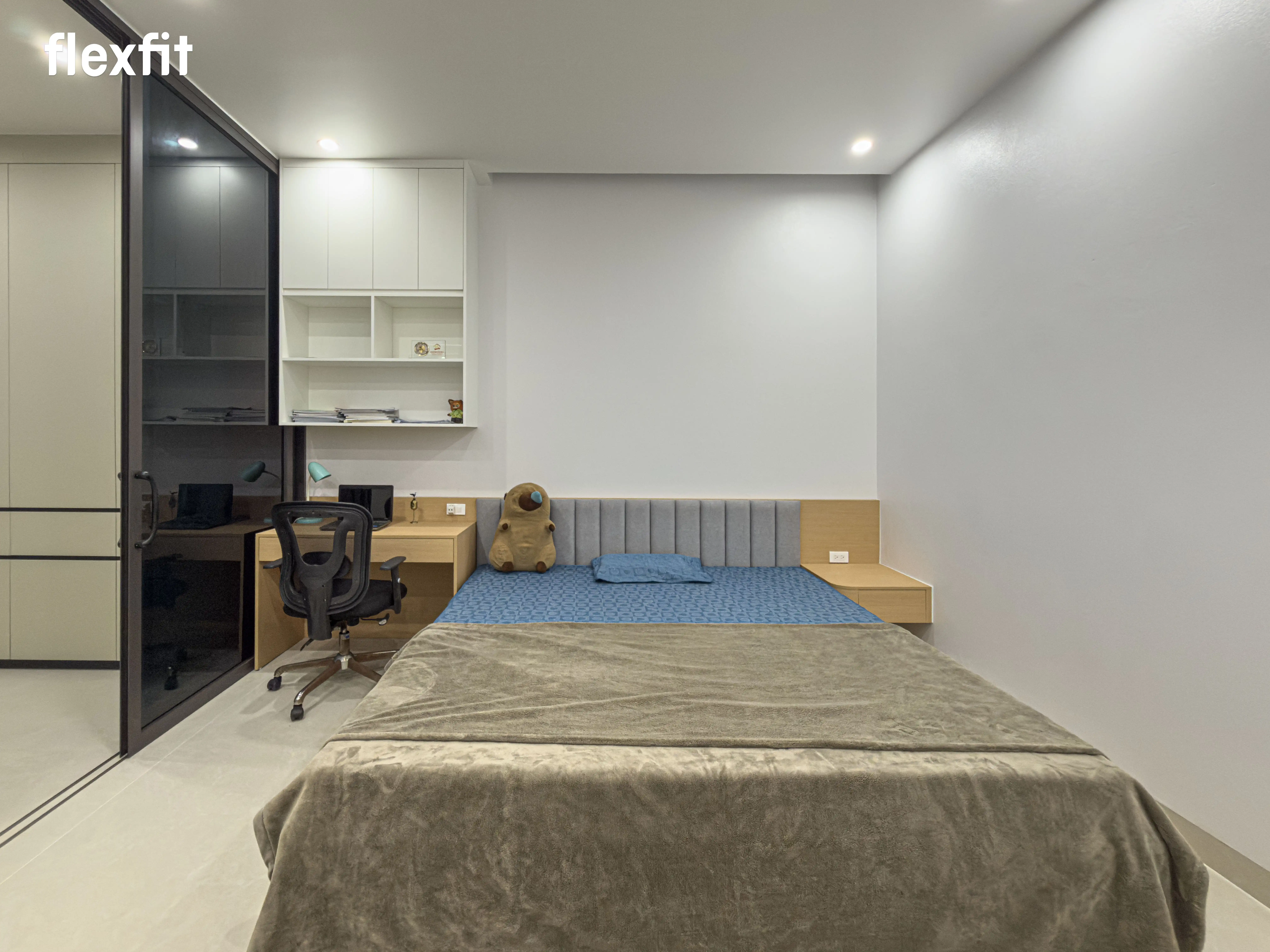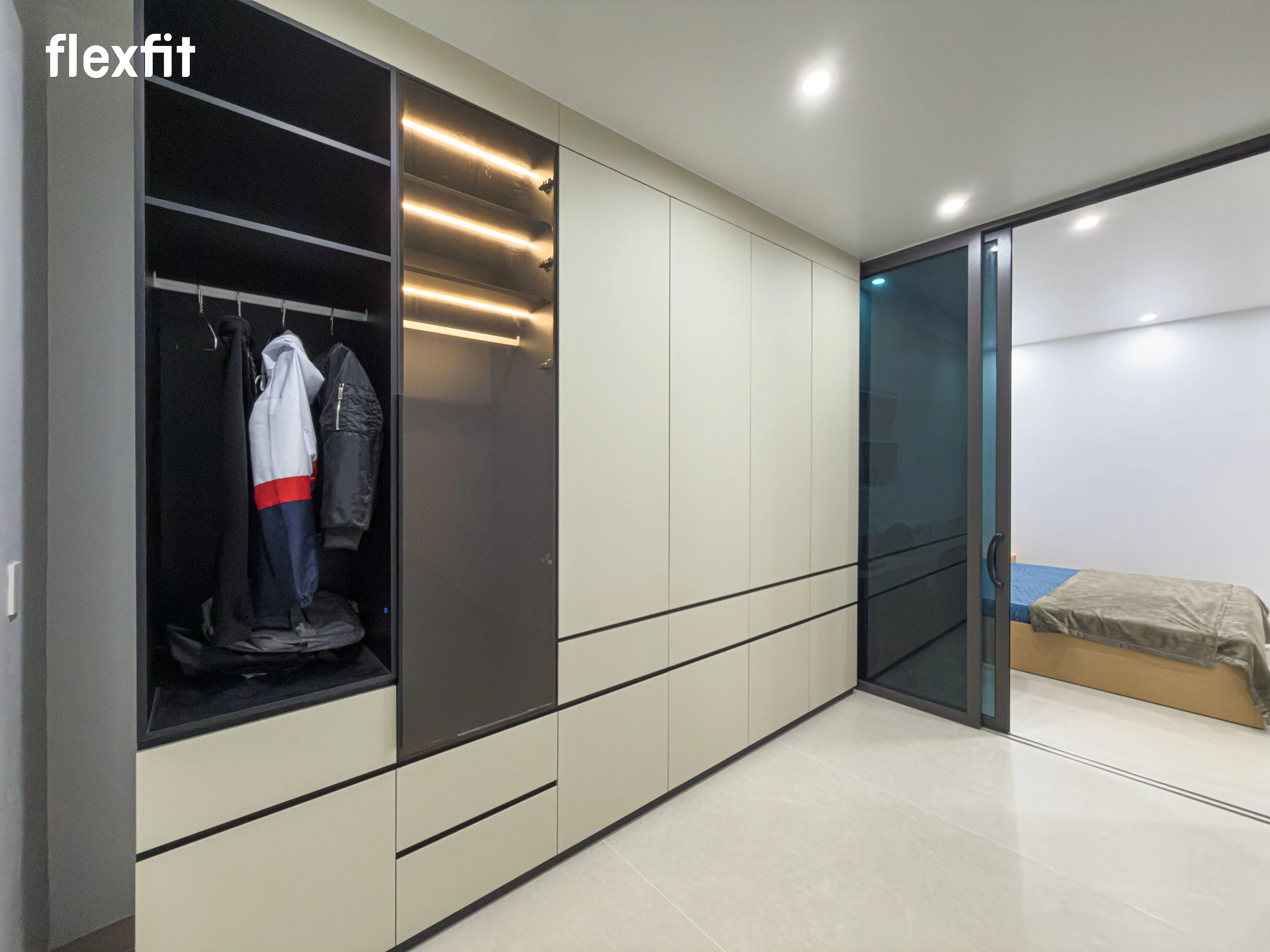 Không gian nghỉ ngơi riêng tư, tĩnh tại. Sử dụng tông màu gỗ trầm kết hợp ánh sáng đèn LED dịu nhẹ. Điểm nhấn là hệ tủ áo cánh kính thời thượng, vừa lưu trữ vừa trưng bày trang phục như một showroom thu nhỏ.