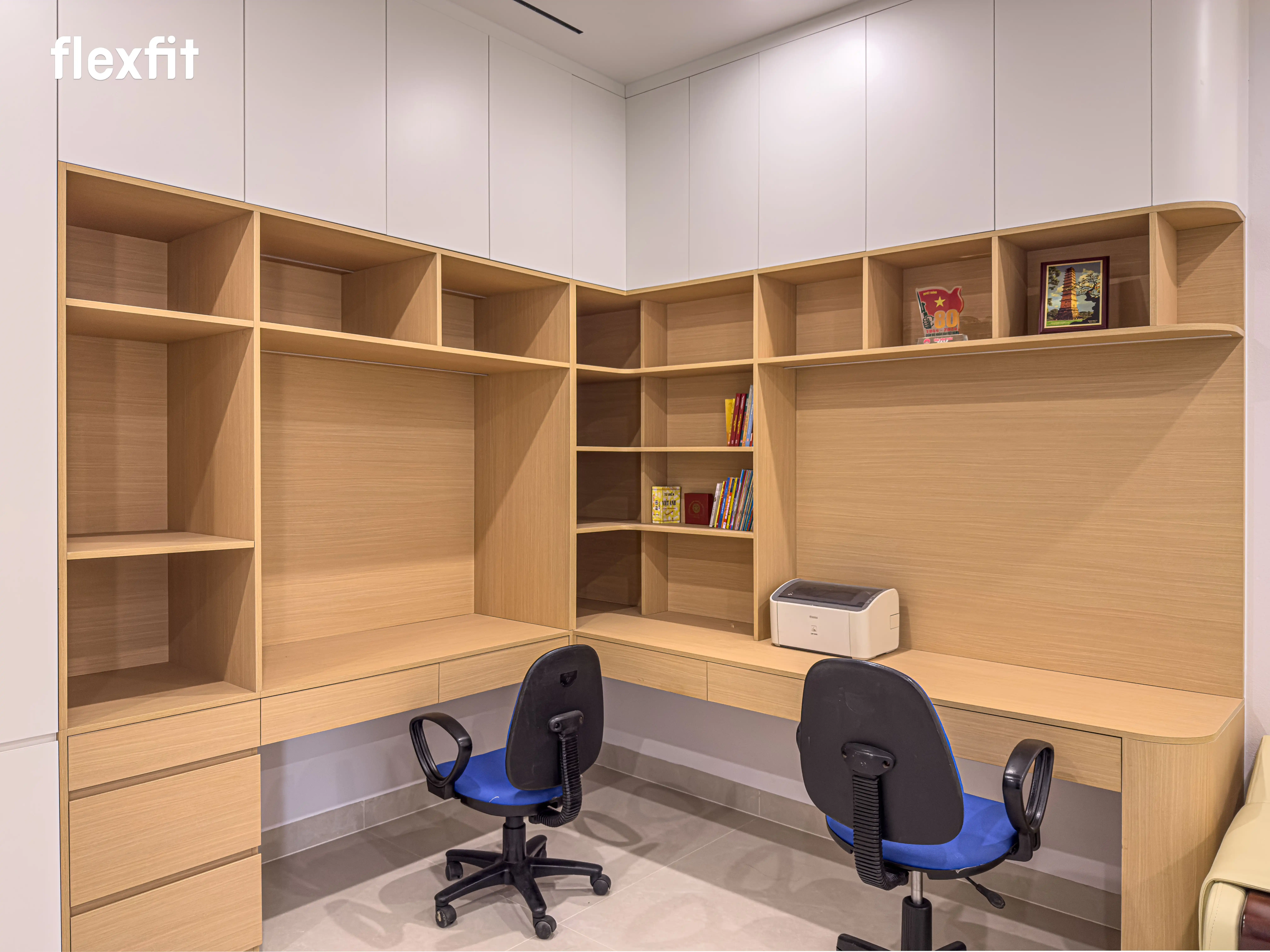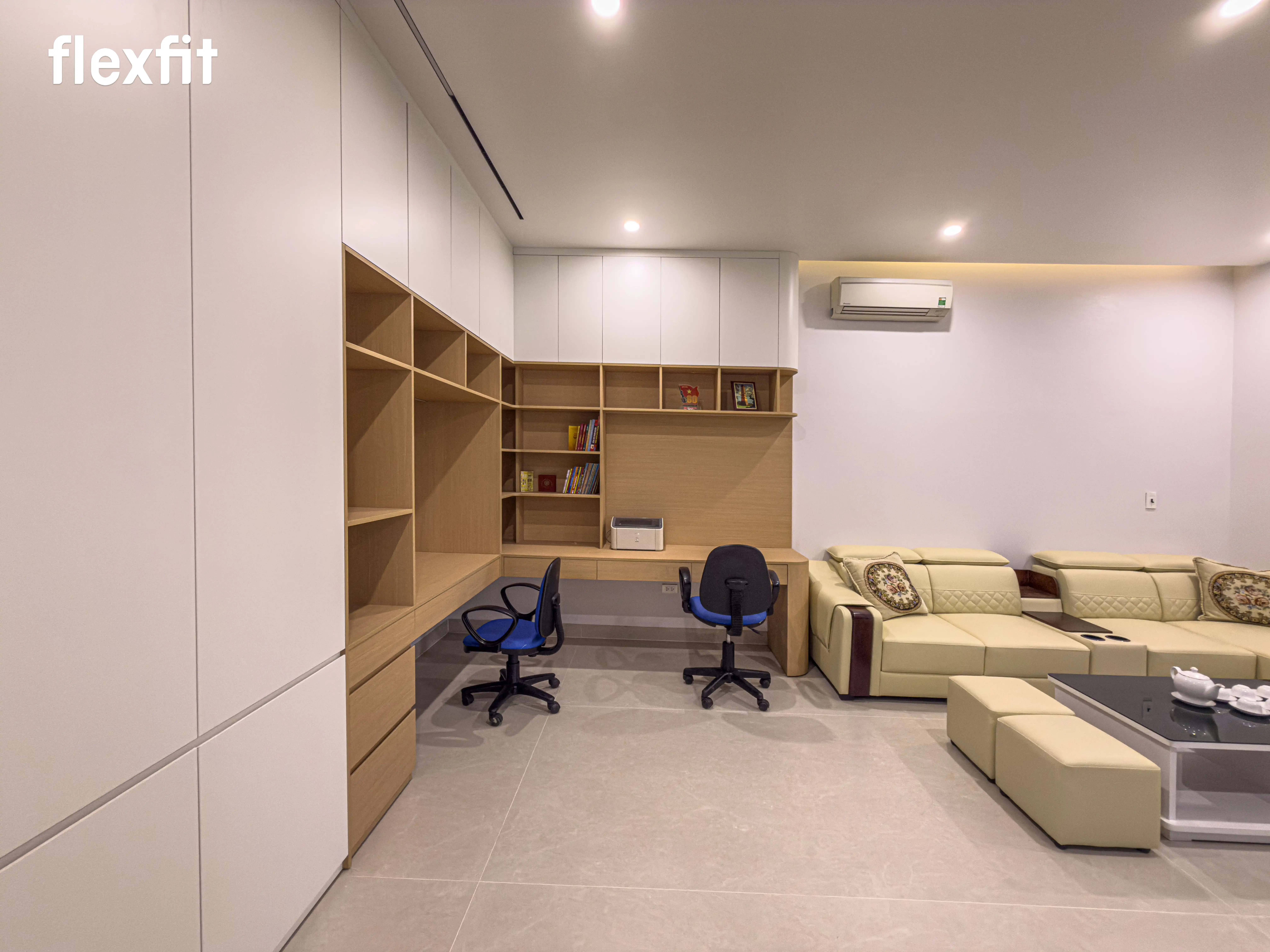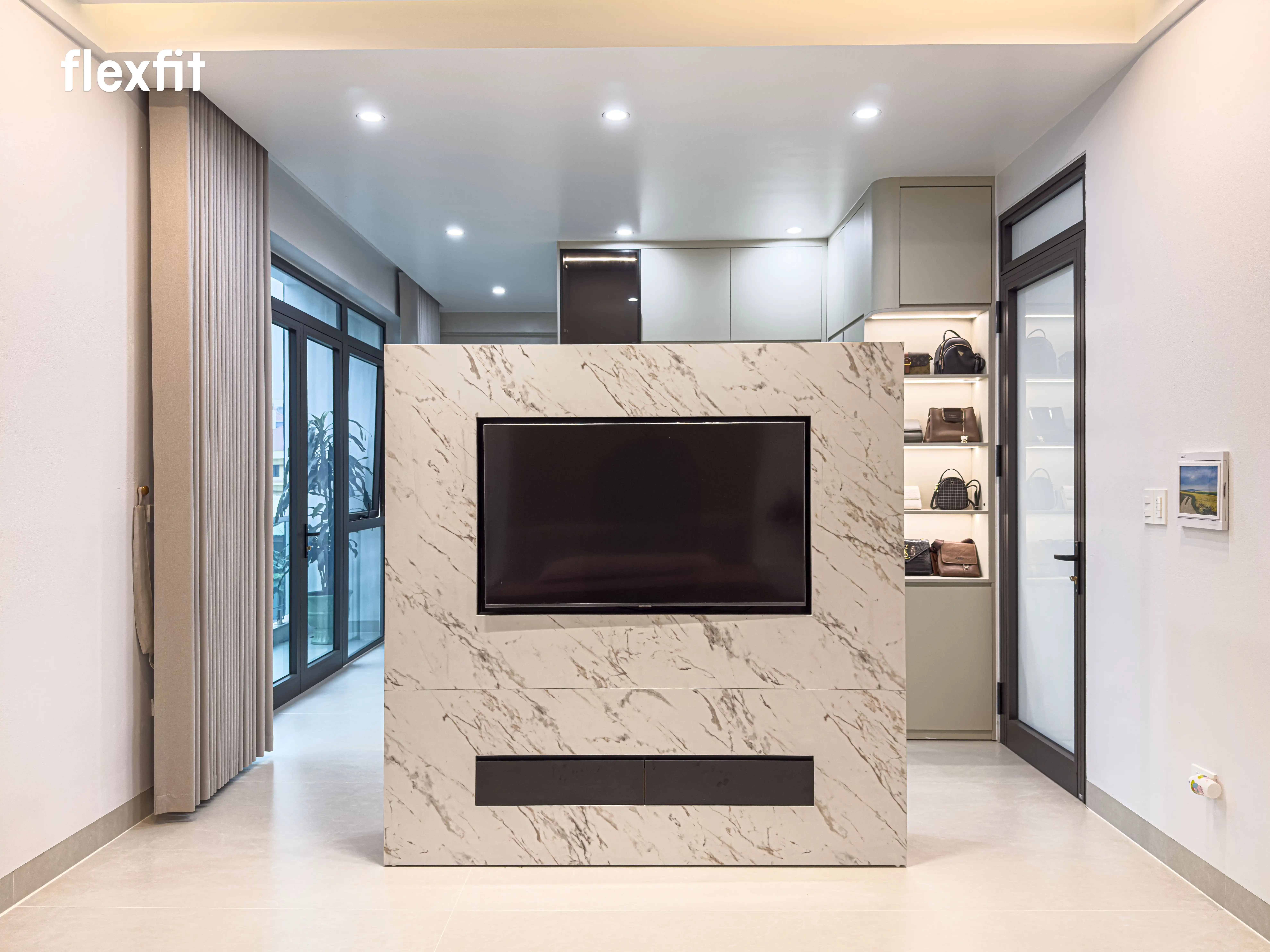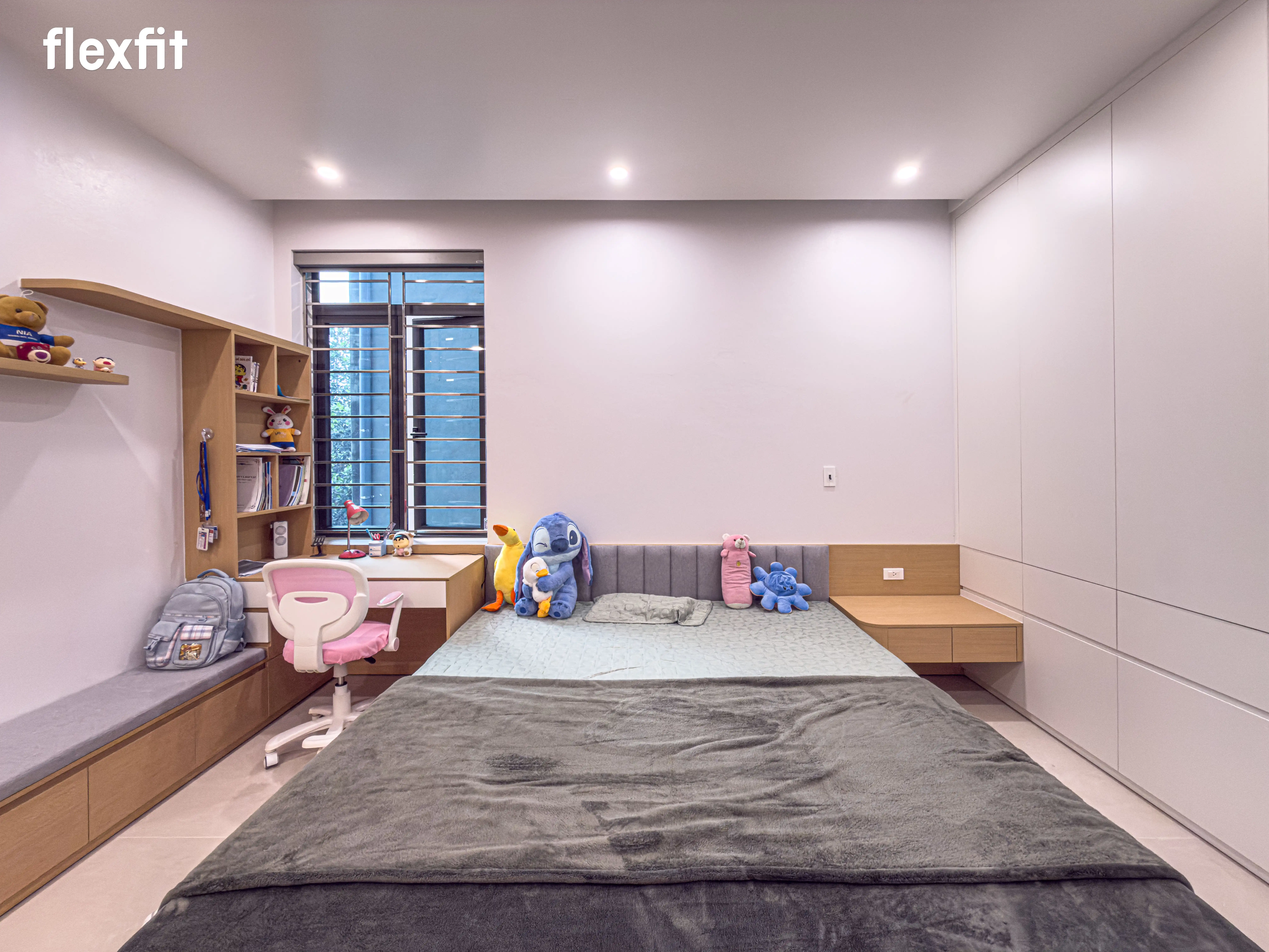 Không gian nghỉ ngơi riêng tư, tĩnh tại. Sử dụng tông màu gỗ trầm kết hợp ánh sáng đèn LED dịu nhẹ. Điểm nhấn là hệ tủ áo cánh kính thời thượng, vừa lưu trữ vừa trưng bày trang phục như một showroom thu nhỏ.