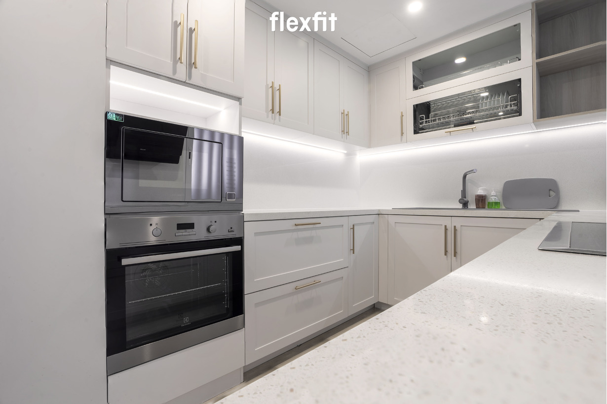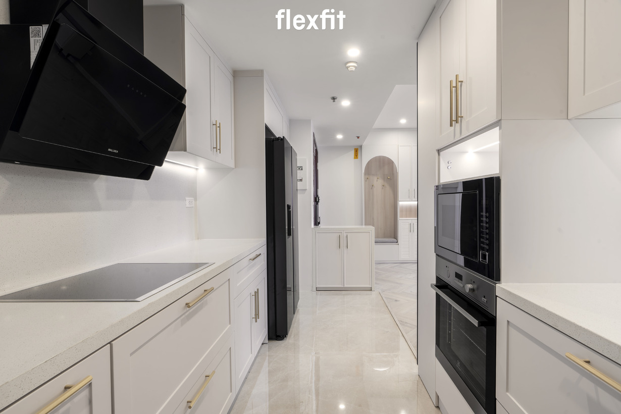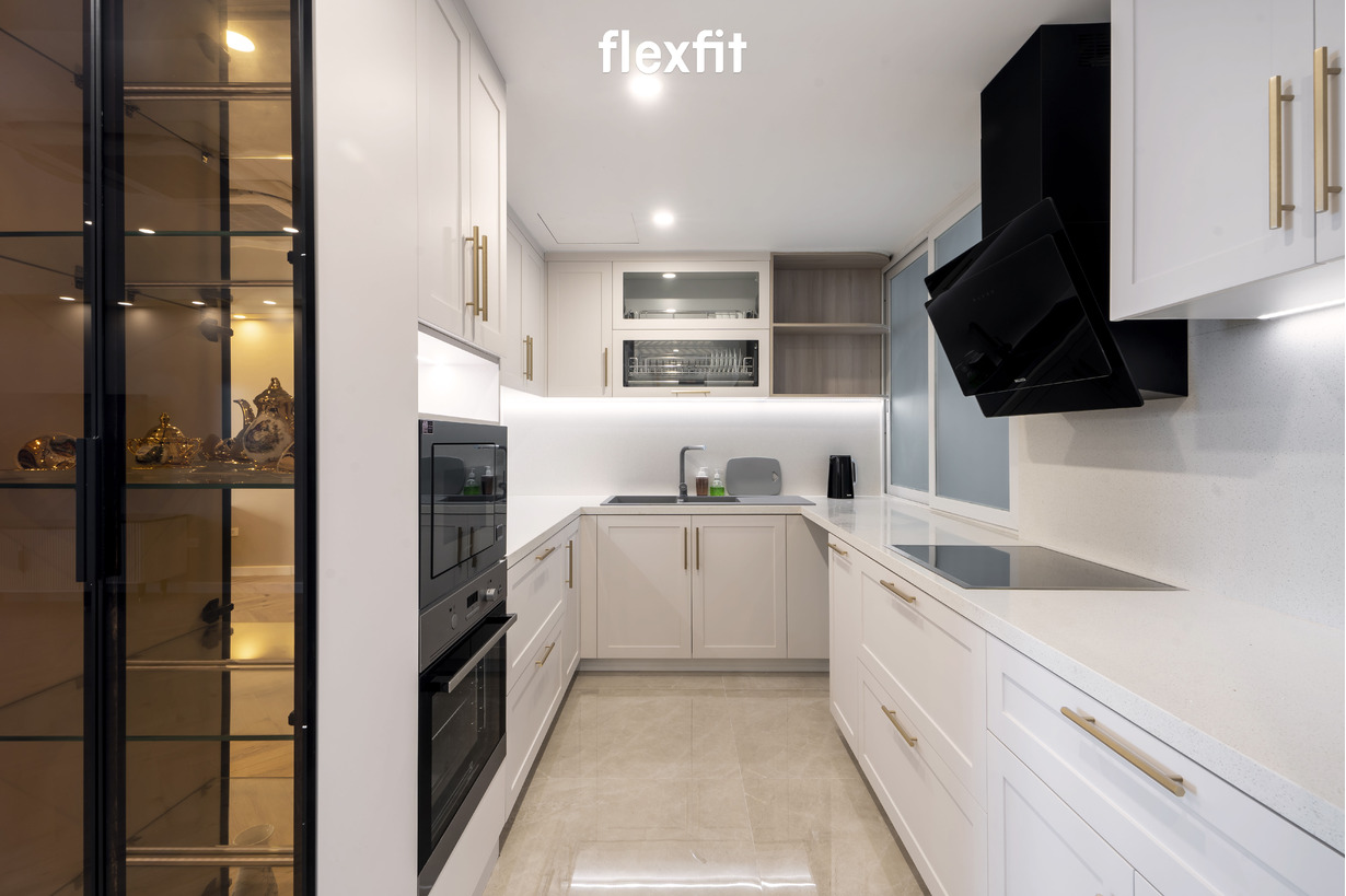 Với mong muốn mọi thành viên trong gia đình có thể cùng nhau tham gia nấu nướng của gia chủ, Flexfit đã lựa chọn hệ tủ bếp chữ U, kiểu bếp lý tưởng cho hai người nấu. Bếp chữ U, với sự tối ưu hóa không gian thông minh, mang đến không gian nấu nướng thoải mái và tiện nghi. Thiết kế này giúp tận dụng hiệu quả mọi ngóc ngách trong căn bếp, từ việc lắp đặt thiết bị đến bố trí tủ và kệ.
