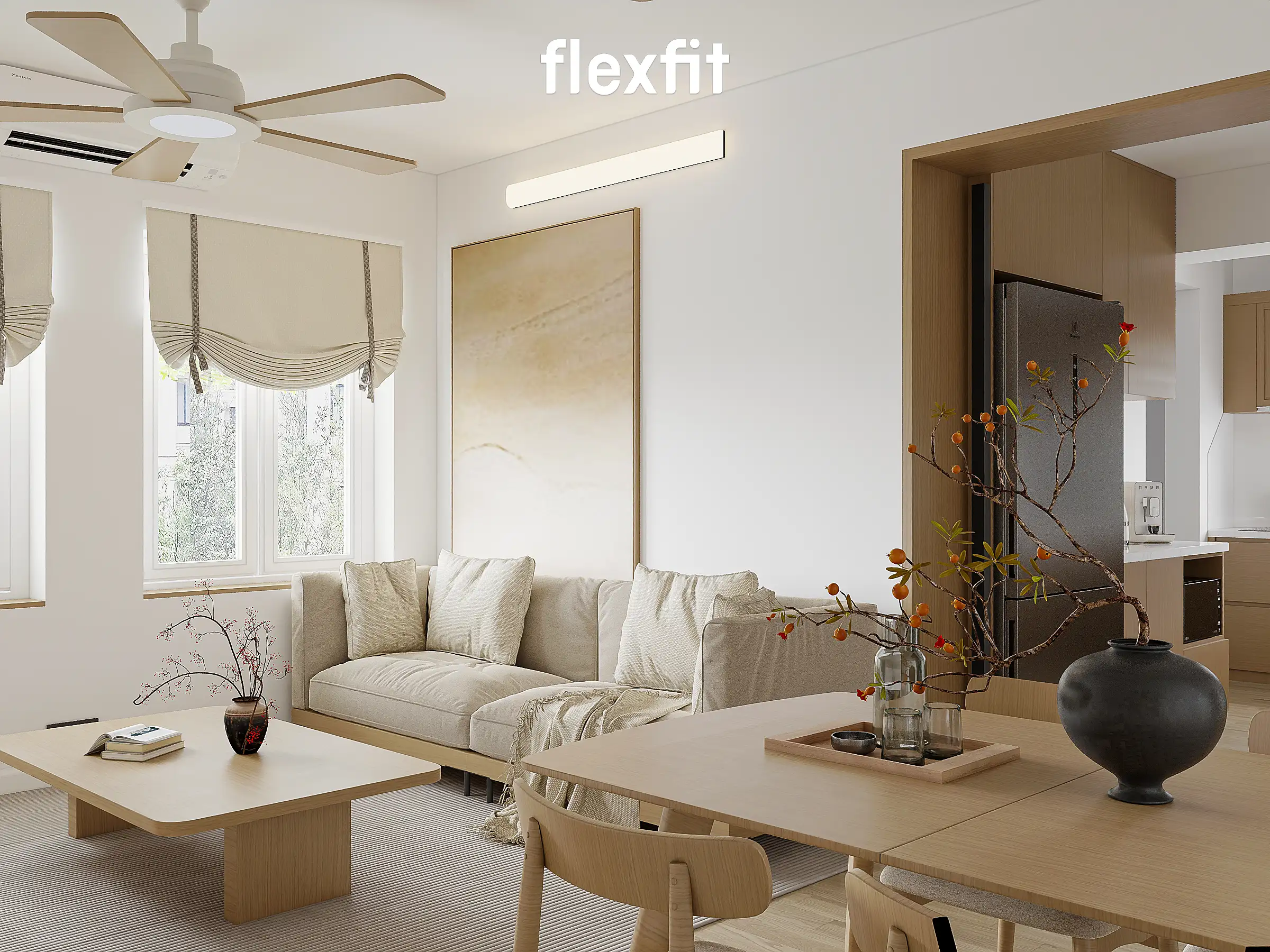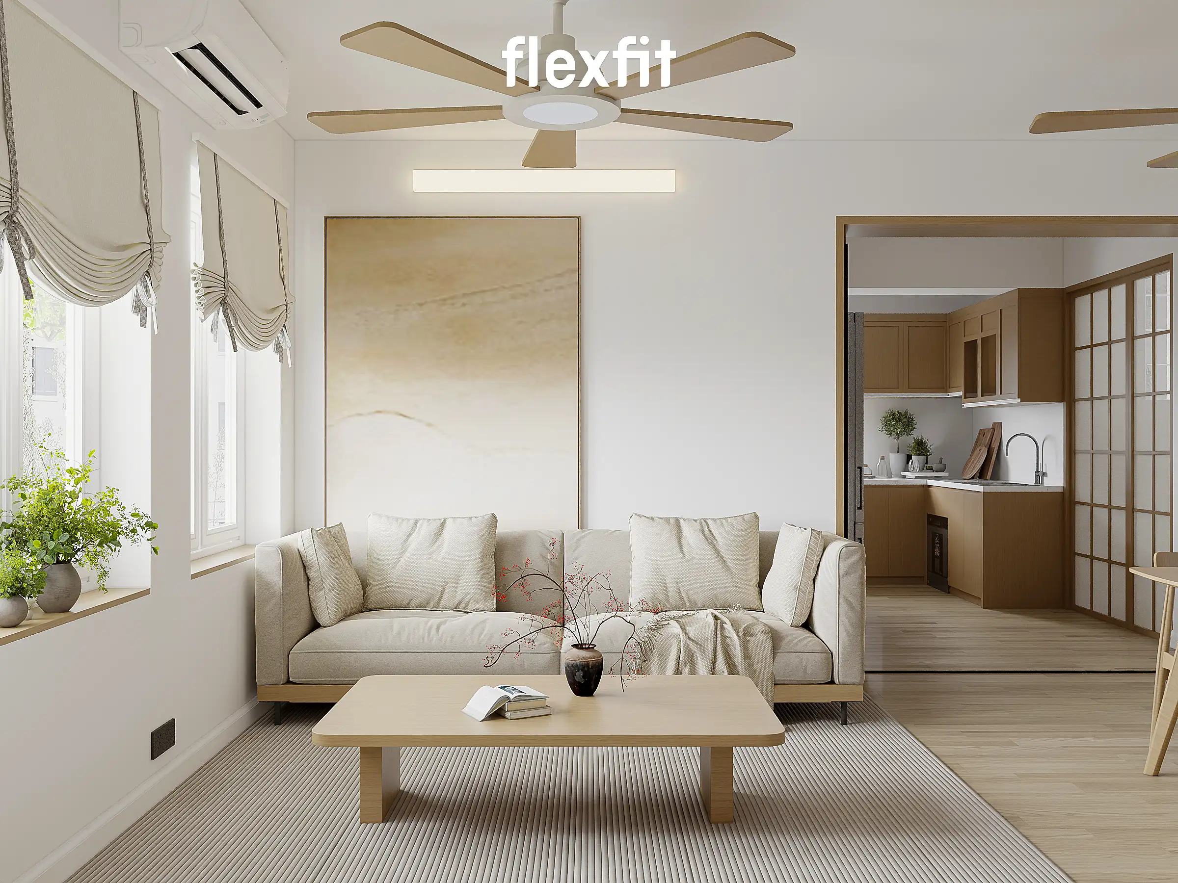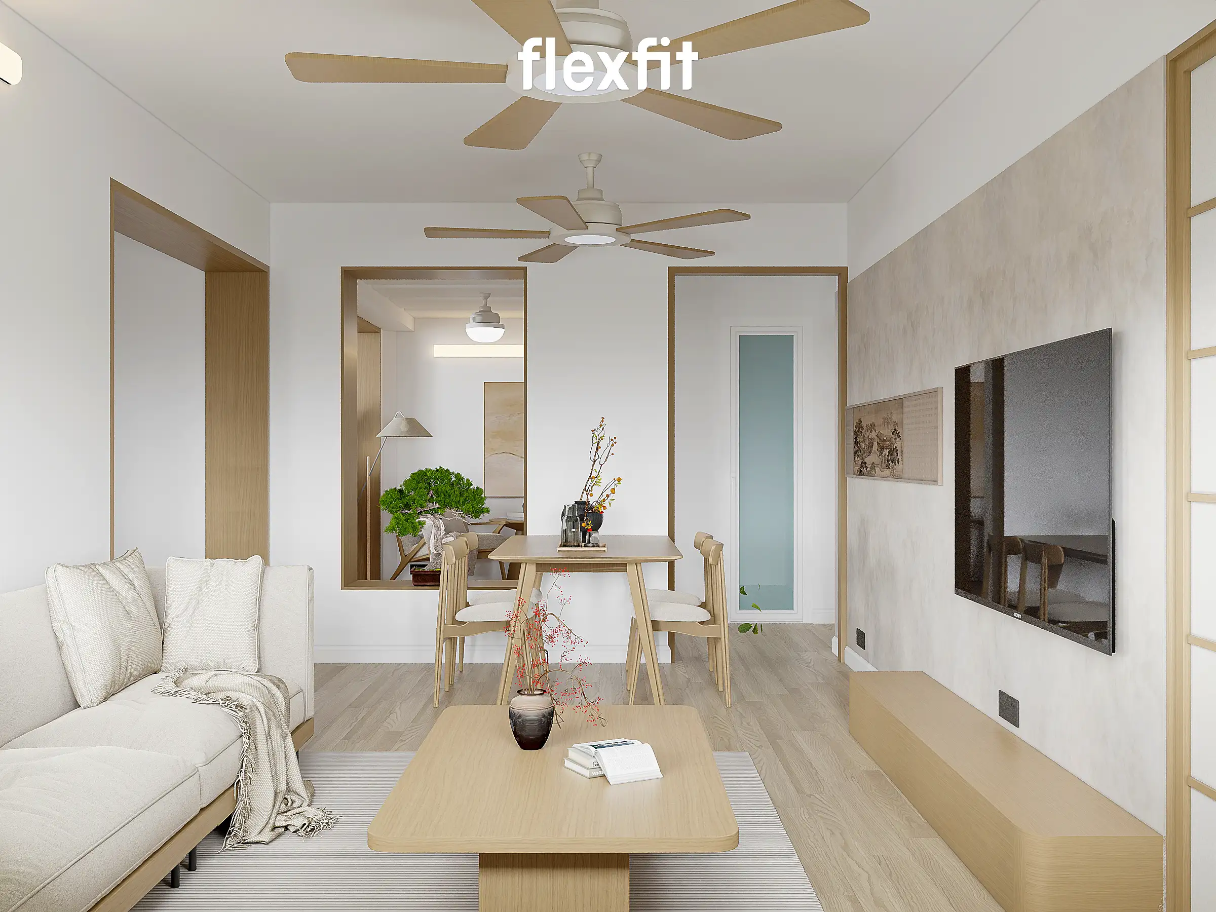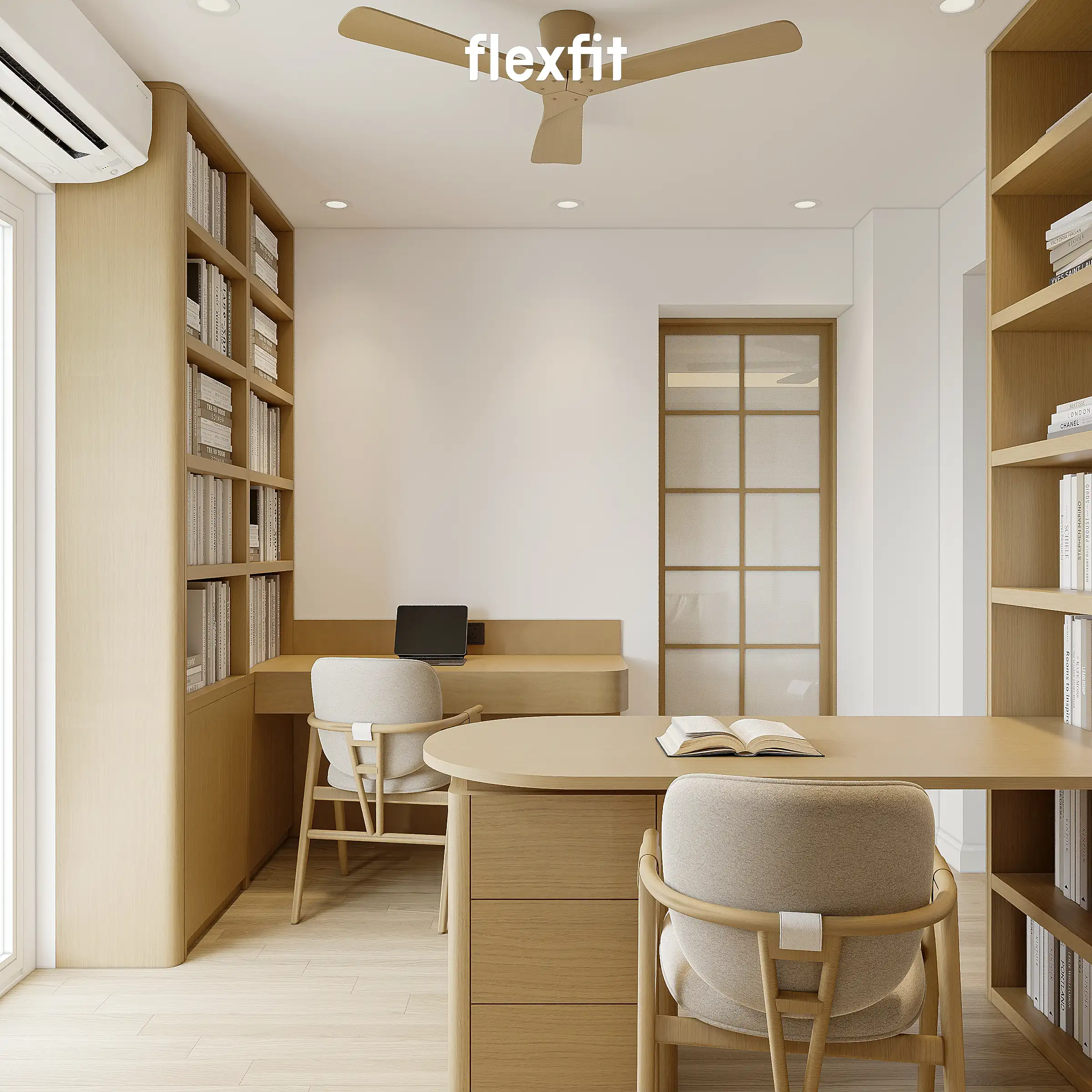 - Ánh Sáng: Tận dụng tối đa ánh sáng tự nhiên qua cửa sổ lớn. Rèm Roman màu be tạo sự mềm mại và điều chỉnh ánh sáng linh hoạt. Quạt trần cánh gỗ (tối giản kiểu Scandinavian) vừa làm mát vừa làm điểm nhấn.