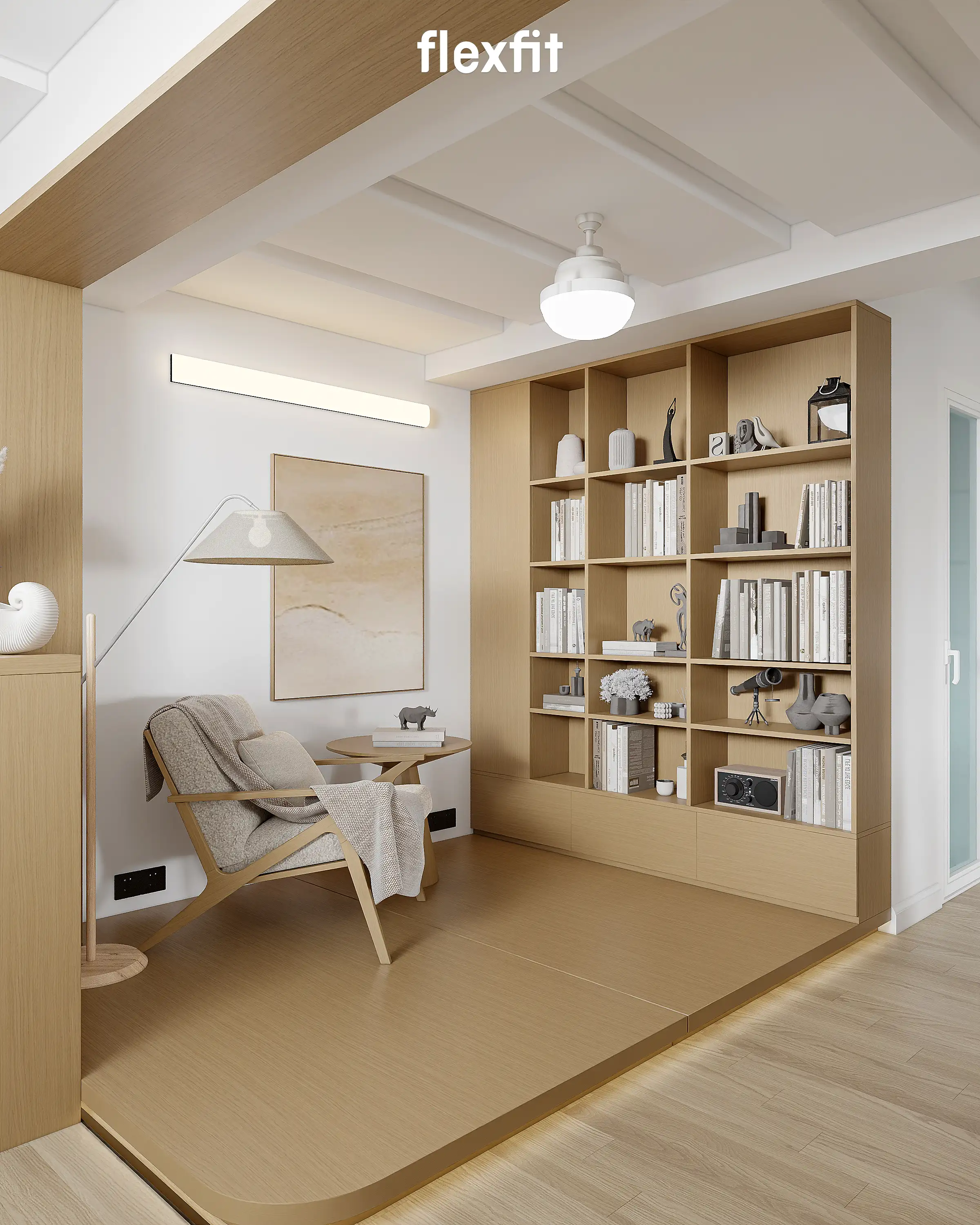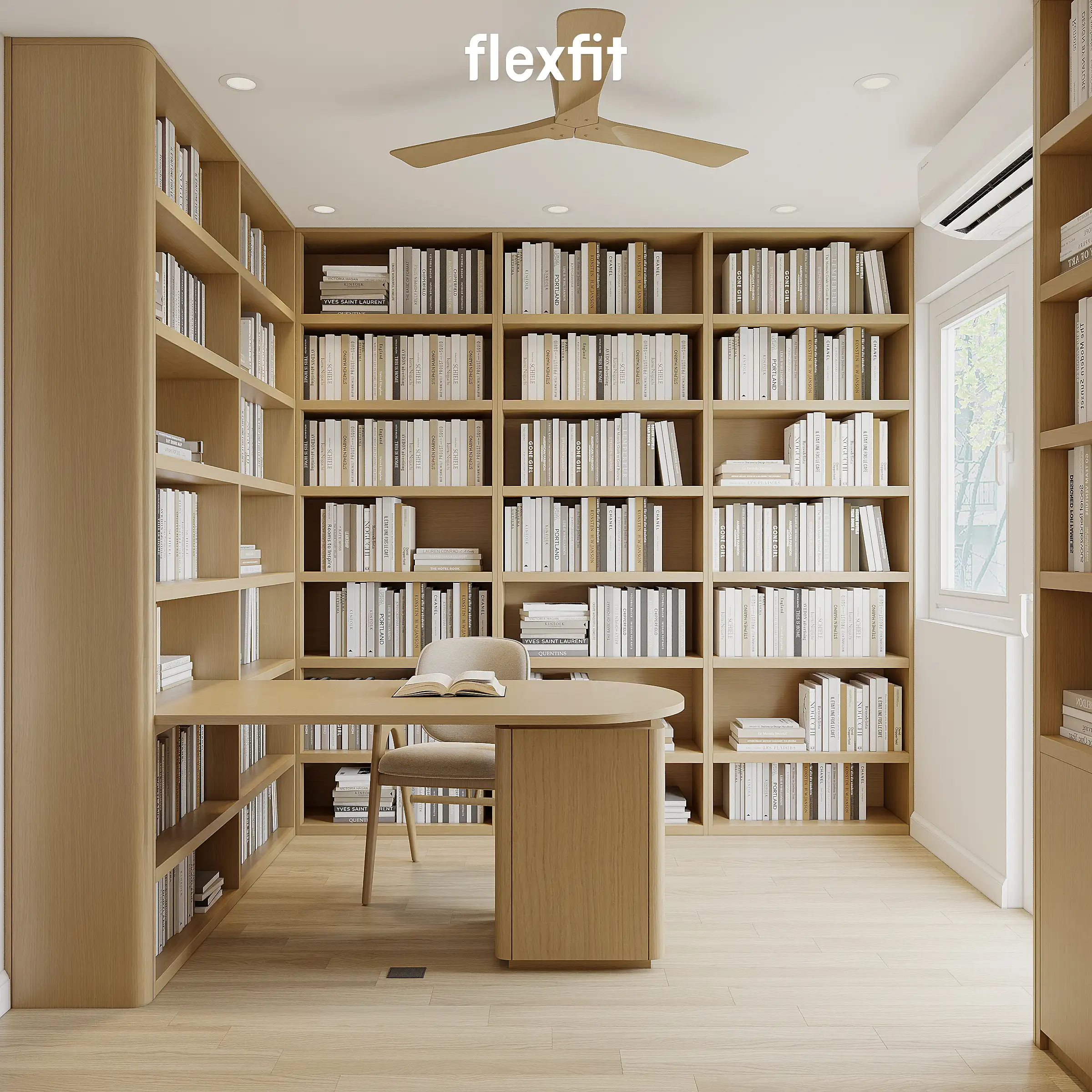 - Hệ Kệ Sách: Toàn bộ căn phòng được bao phủ bởi hệ kệ sách kịch trần bằng gỗ sáng, tối đa hóa khả năng lưu trữ. Kệ được chia ô vuông vắn, mang lại cảm giác ngăn nắp và đồ sộ.