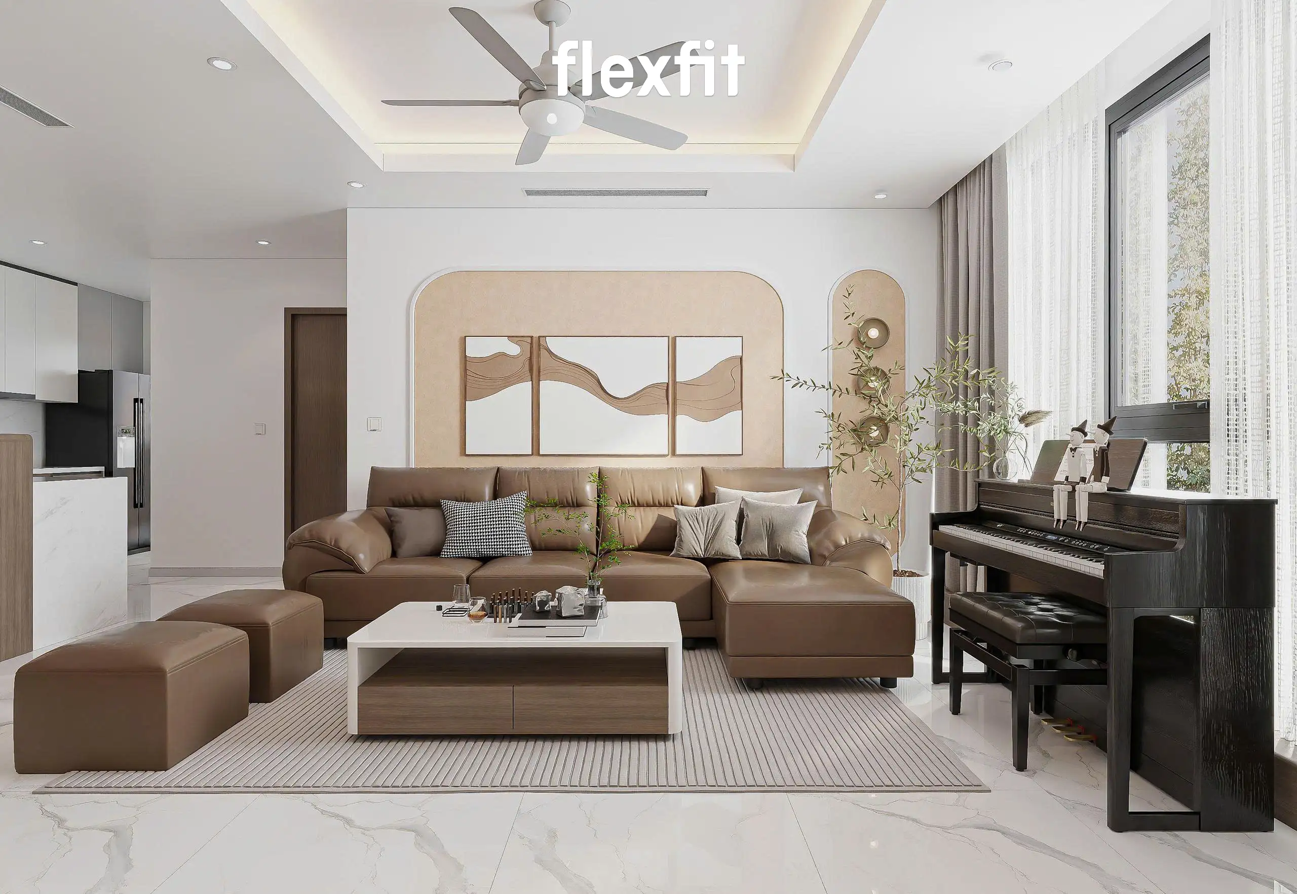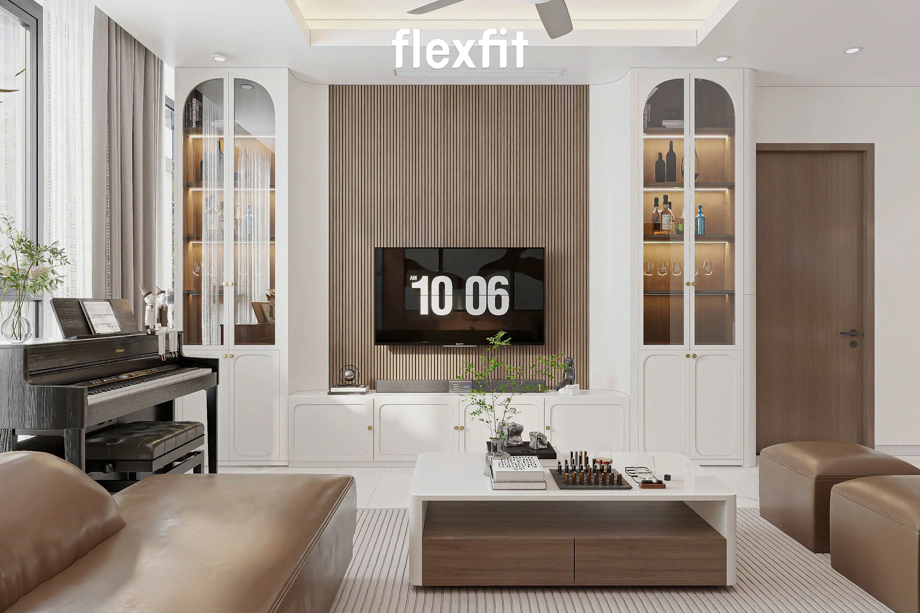 Phòng khách là trung tâm của sự sang trọng và sở thích cá nhân, được thiết kế đối xứng và ấm cúng. Tường và trần nhà tông trắng chủ đạo tương phản mạnh mẽ với sofa da lớn chữ L màu nâu caramel ấm áp. Đối diện sofa là hệ tủ TV và trưng bày kịch trần màu trắng. Đặc biệt, hai bên TV là các tủ trưng bày bằng kính với nóc cong, một chi tiết Tân Cổ Điển tinh tế, dùng để chứa rượu hoặc vật phẩm trang trí. Sự hiện diện của đàn Piano lớn bên cửa sổ càng khẳng định sở thích nghệ thuật và đẳng cấp của gia chủ.