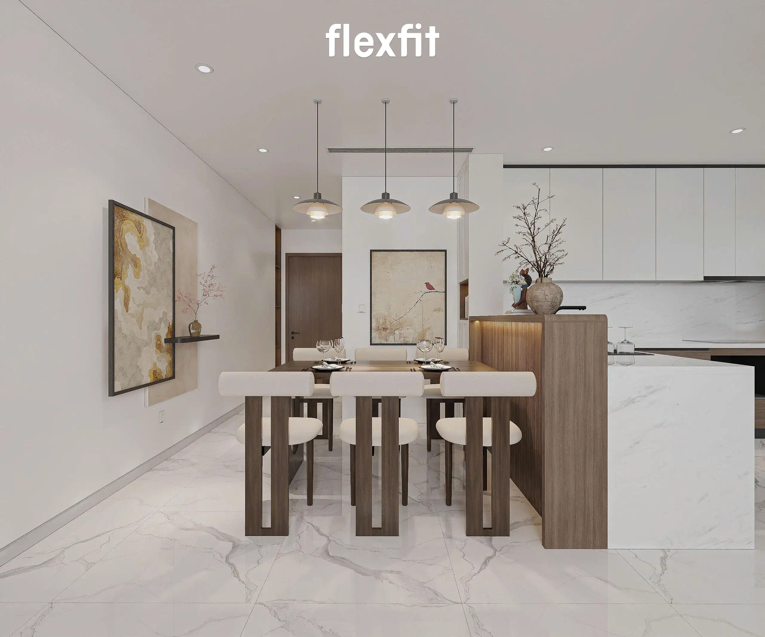 Phòng ăn và bếp được phân vùng thông minh để tối ưu hóa không gian. Khu vực ăn đặt cạnh bếp, với bàn và ghế hiện đại, có điểm nhấn là ghế ăn khung gỗ sẫm màu với lưng tựa cao tạo sự trang trọng. Sự phân chia giữa bếp và ăn được thực hiện bằng một quầy bar/đảo bếp lửng ốp đá marble trắng và gỗ sọc. Thiết kế này không chỉ tạo ra nơi chuẩn bị đồ ăn tiện lợi mà còn là không gian chuyển tiếp thẩm mỹ, đồng thời hệ tủ bếp trên dưới màu trắng tối giản đảm bảo sự sạch sẽ và hiện đại cho toàn bộ khu vực nấu nướng.