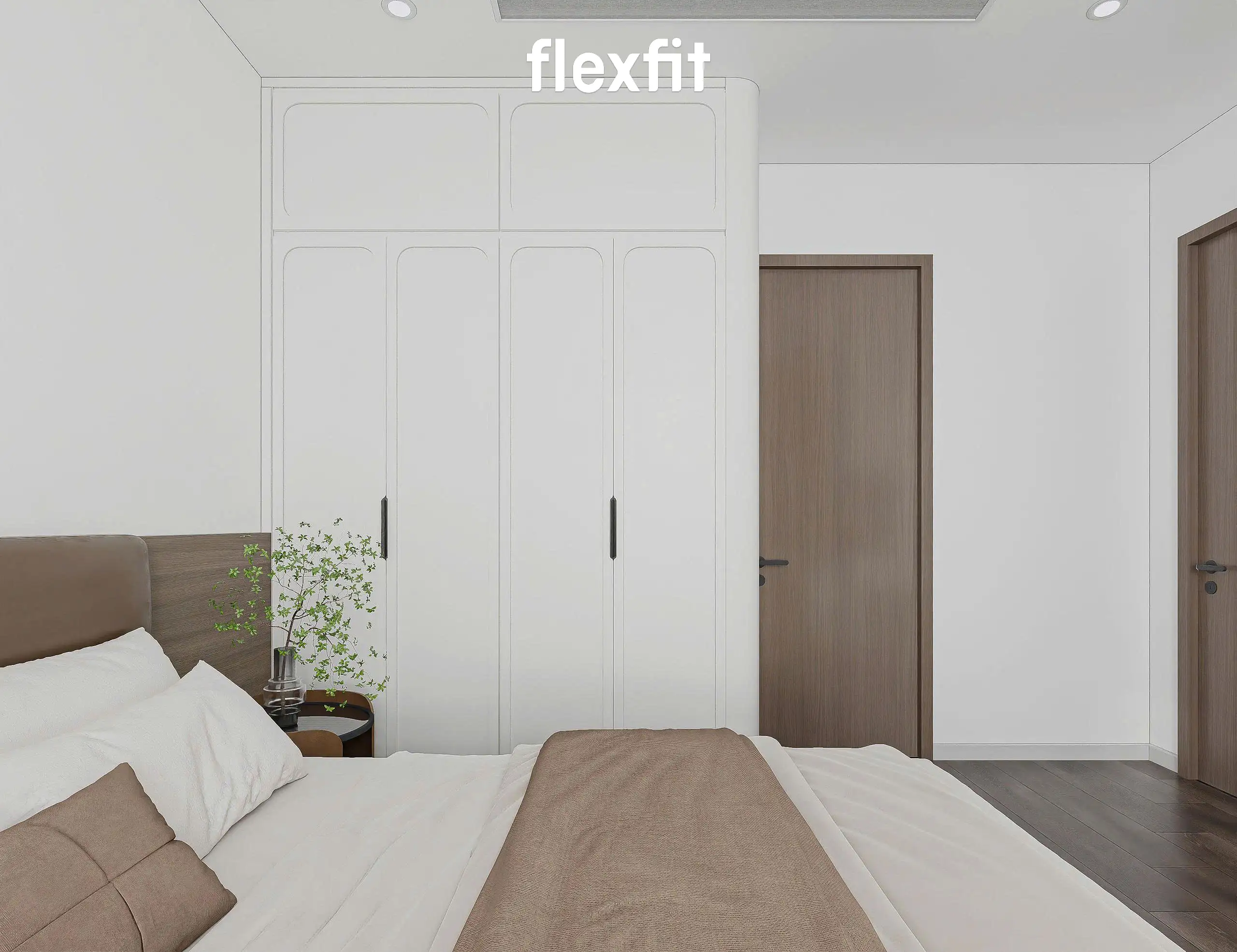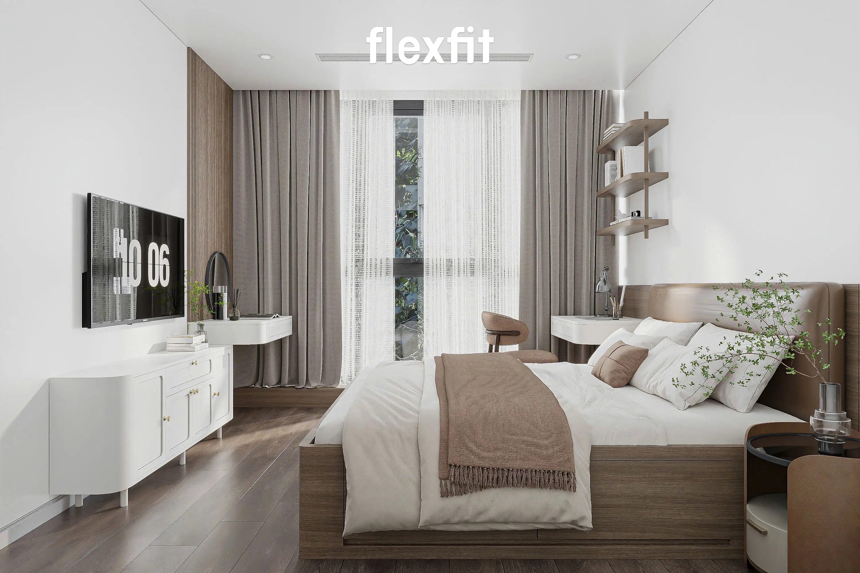 Phòng ngủ này tập trung vào sự tiện nghi và ánh sáng tự nhiên cho khu vực làm việc. Giường ngủ được đặt giữa phòng với đầu giường ốp gỗ thấp, tạo sự tập trung. Khu vực làm việc/trang điểm được bố trí sát cửa sổ, tận dụng ánh sáng tốt nhất. Đặc biệt, tủ quần áo kịch trần màu trắng và tủ TV/bàn trang điểm màu trắng có đường cong mềm mại được sử dụng để tối đa hóa lưu trữ và duy trì tính thẩm mỹ hiện đại, ngăn nắp.