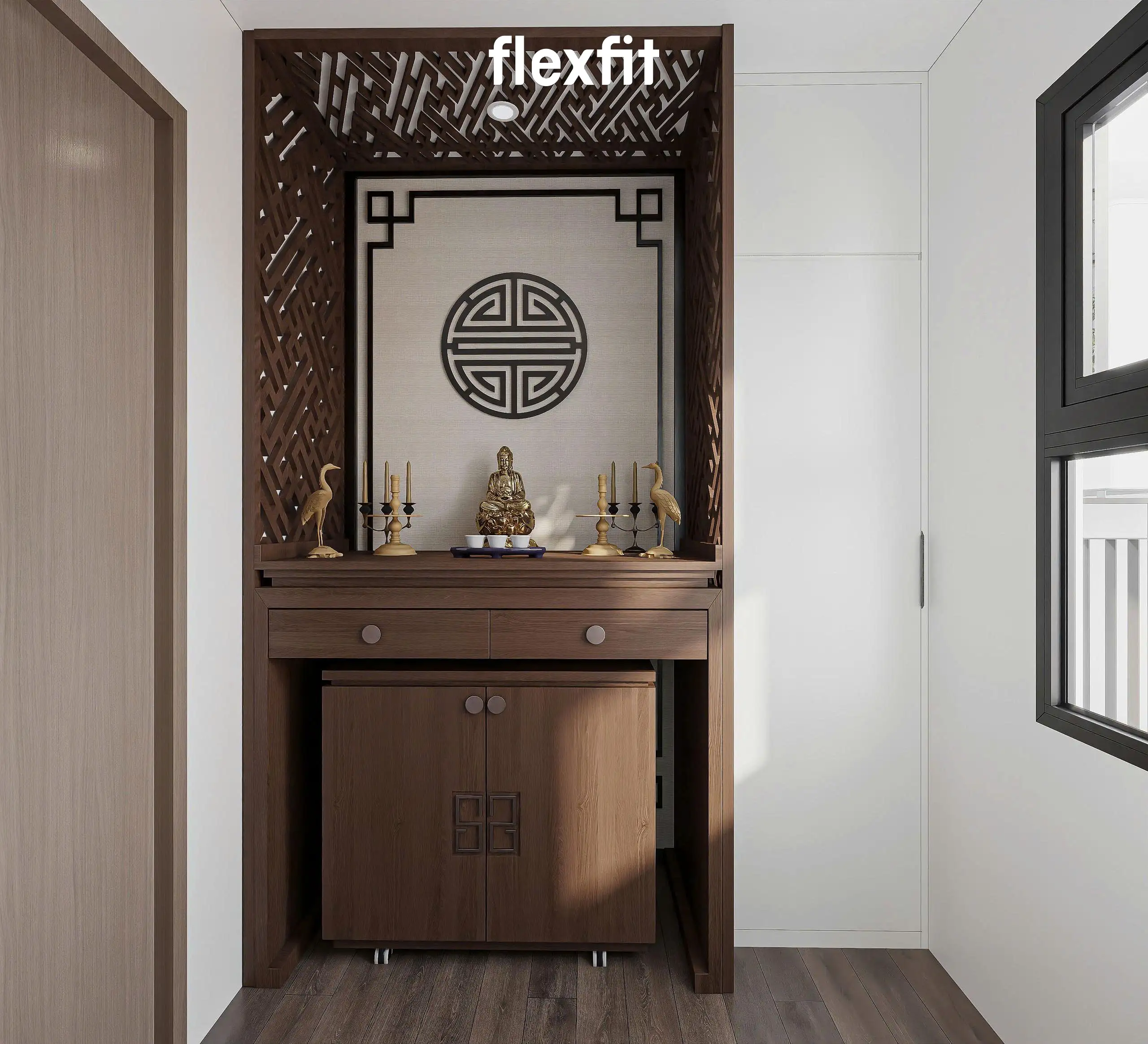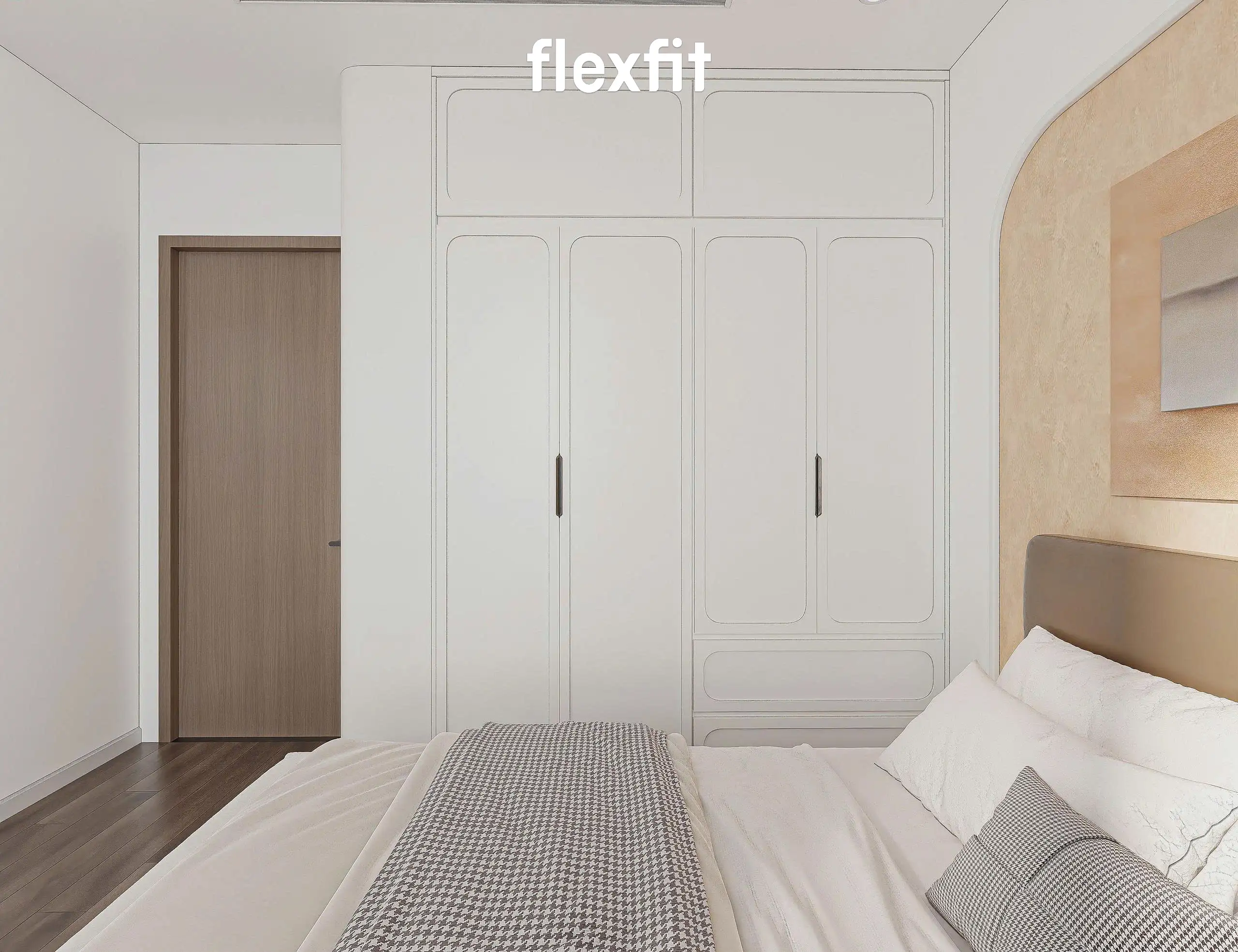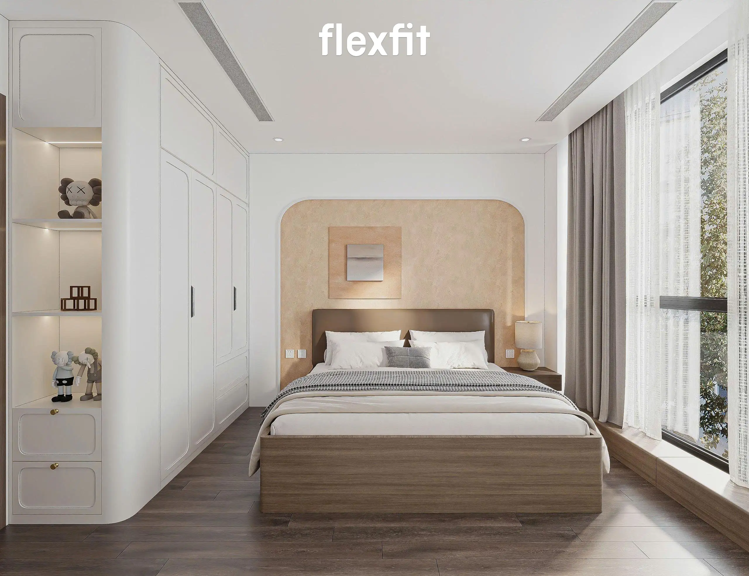 Phòng ngủ này mang lại cảm giác ấm áp và cá tính riêng nhờ việc sử dụng đường cong. Giường ngủ có khung gỗ màu nâu sẫm, tương phản với mảng tường đầu giường màu be hồng được thiết kế hình vòm. Sự mềm mại còn được thấy qua hệ tủ quần áo kịch trần màu trắng với các góc bo cong. Điểm nhấn cá nhân là kệ trưng bày đồ chơi/sưu tầm được tích hợp ngay cạnh tủ, giúp không gian vừa ngăn nắp vừa thể hiện sở thích của chủ nhân.