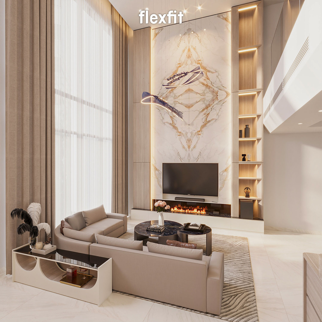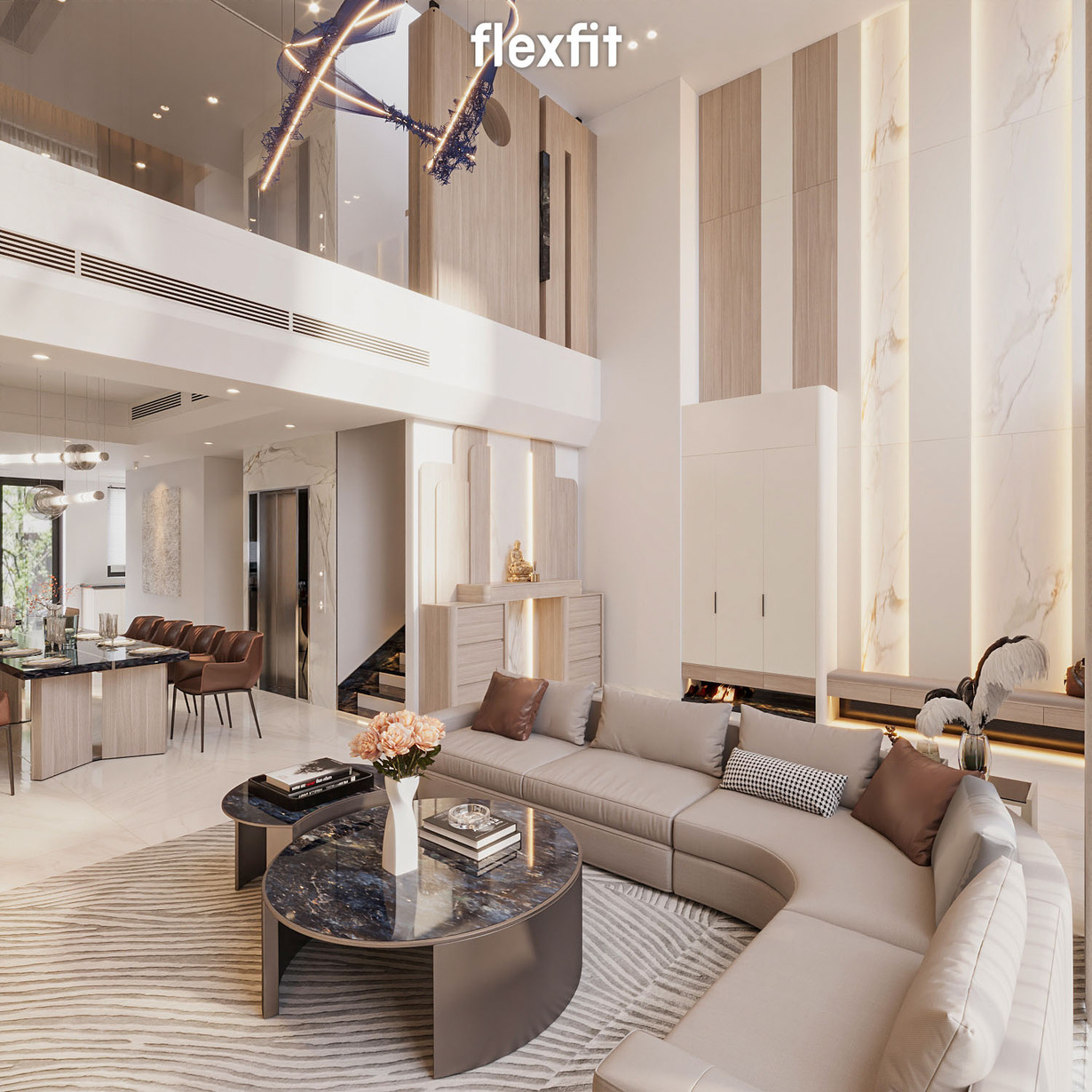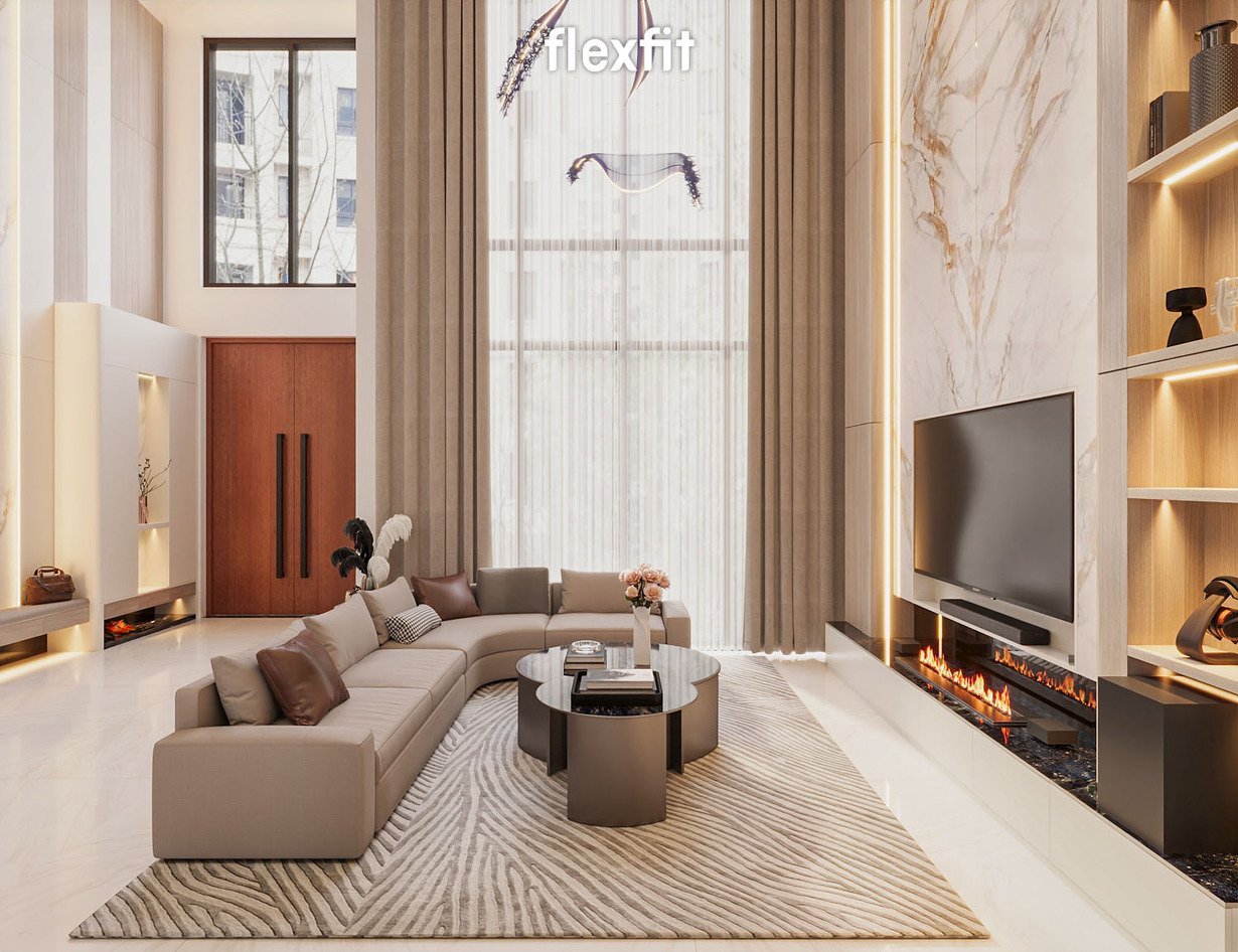Phòng khách được thiết kế theo phong cách Modern Luxury, nổi bật với khoảng thông tầng cao thoáng và ánh sáng tự nhiên tràn ngập từ các ô cửa kính lớn. Gam màu beige - gỗ sáng - ánh champagne hòa quyện tạo cảm giác ấm cúng, tinh tế và đẳng cấp. Không gian này vừa là nơi tiếp khách, vừa là điểm kết nối giữa các tầng, thể hiện rõ phong cách sống hiện đại của gia chủ.