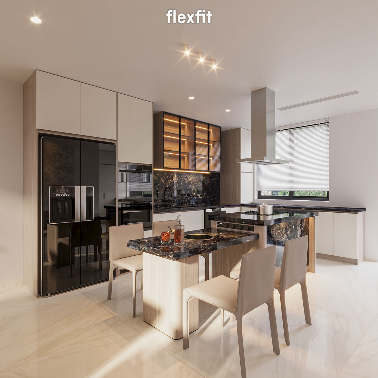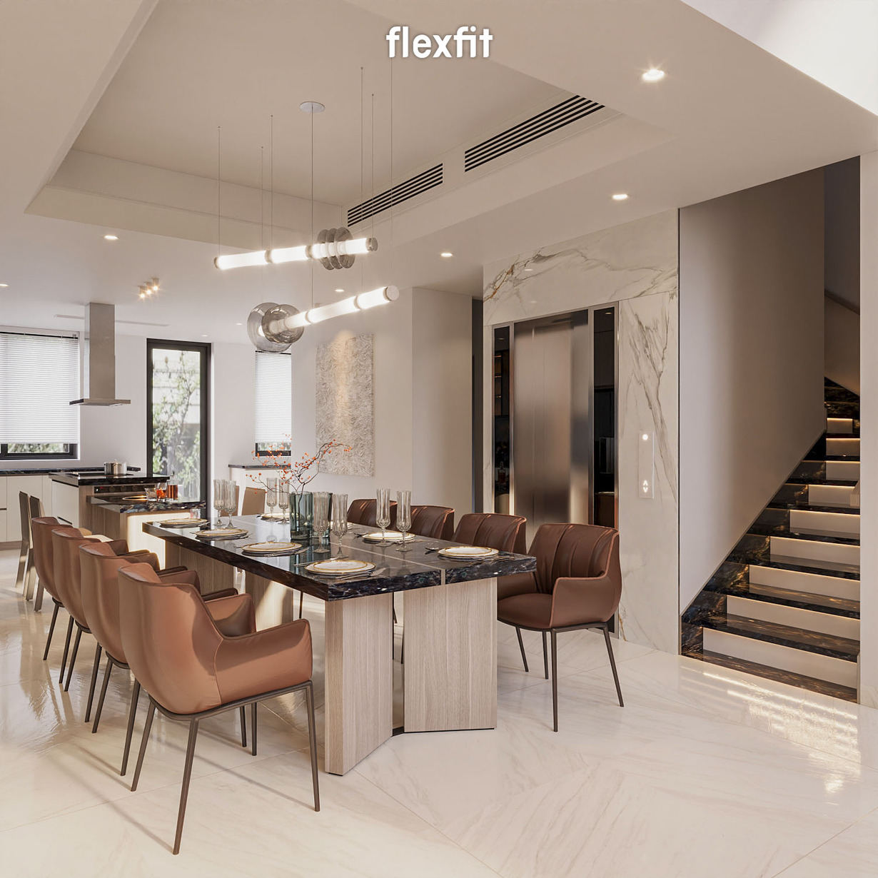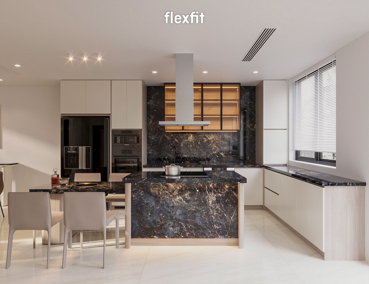 Khu vực bếp được bố trí đảo bếp trung tâm, có thể tích hợp bếp nấu và ghế cao để phục vụ các bữa ăn nhẹ. Tone sáng và vật liệu dễ bảo trì giúp không gian luôn sạch sẽ, hiện đại. Bàn ăn dành cho 8-12 người, đủ rộng cho những bữa tiệc thân mật hay họp mặt gia đình. Mọi chi tiết đều hướng đến sự tiện nghi và ấm cúng.