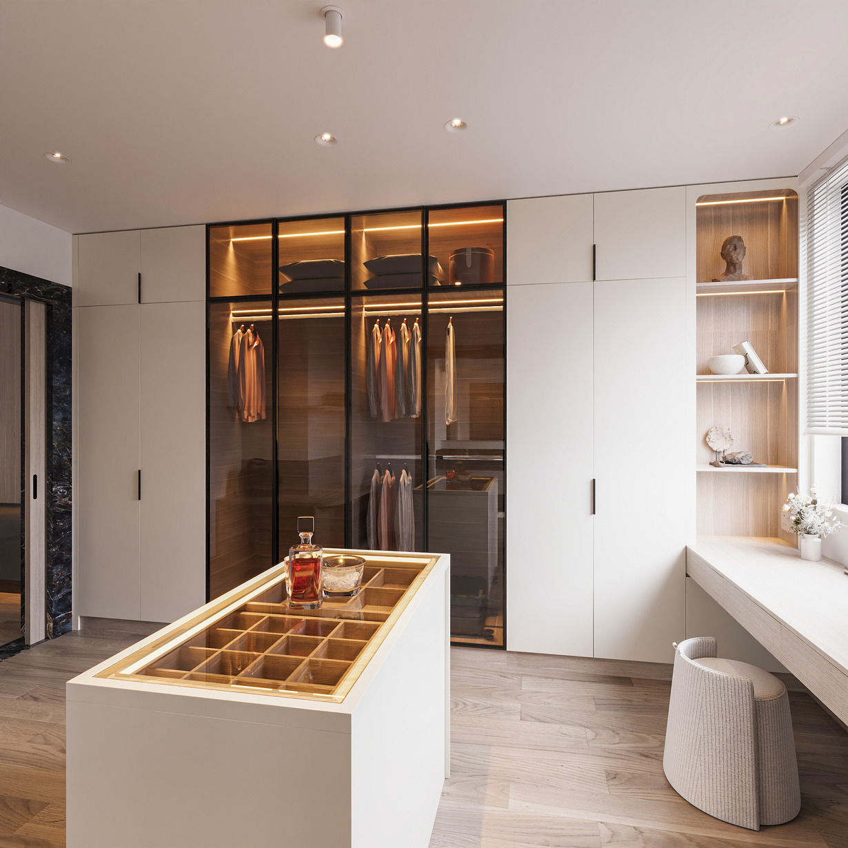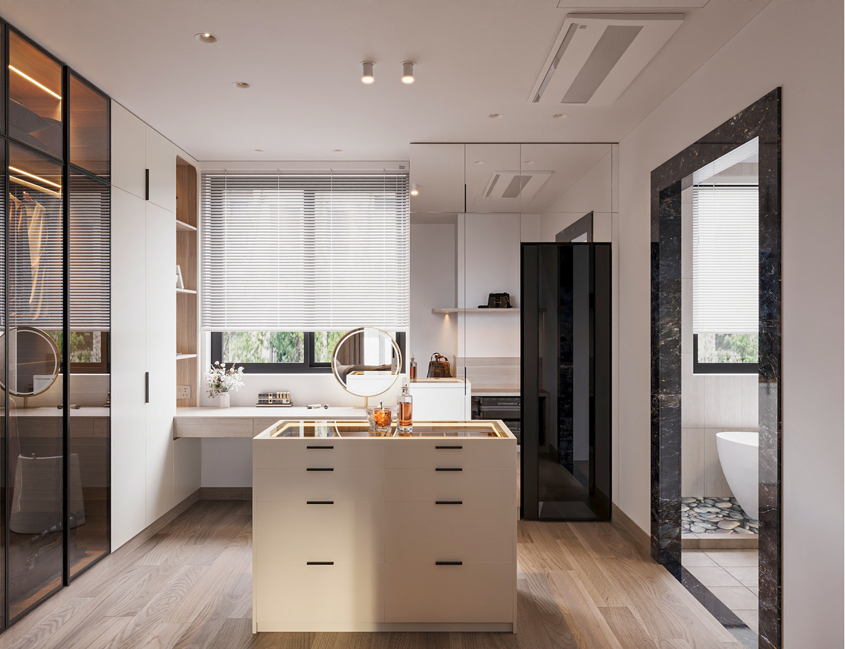 Vật liệu chủ đạo: gỗ tự nhiên, kính lớn, kim loại hoàn thiện ánh champagne, bề mặt đá hoặc veneer cao cấp.
