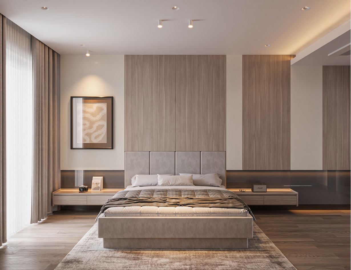 Phòng Master tại tầng 2 là không gian riêng rộng rãi dành cho vợ chồng gia chủ, đủ chỗ đặt nôi cho em bé hiện tại và trong tương lai. Liền kề là phòng thay đồ lớn và phòng tắm riêng có cả bồn tắm và vòi sen, tạo trải nghiệm thư giãn trọn vẹn sau ngày dài. Tông màu beige kết hợp ánh sáng dịu mang lại cảm giác yên bình và sang trọng.