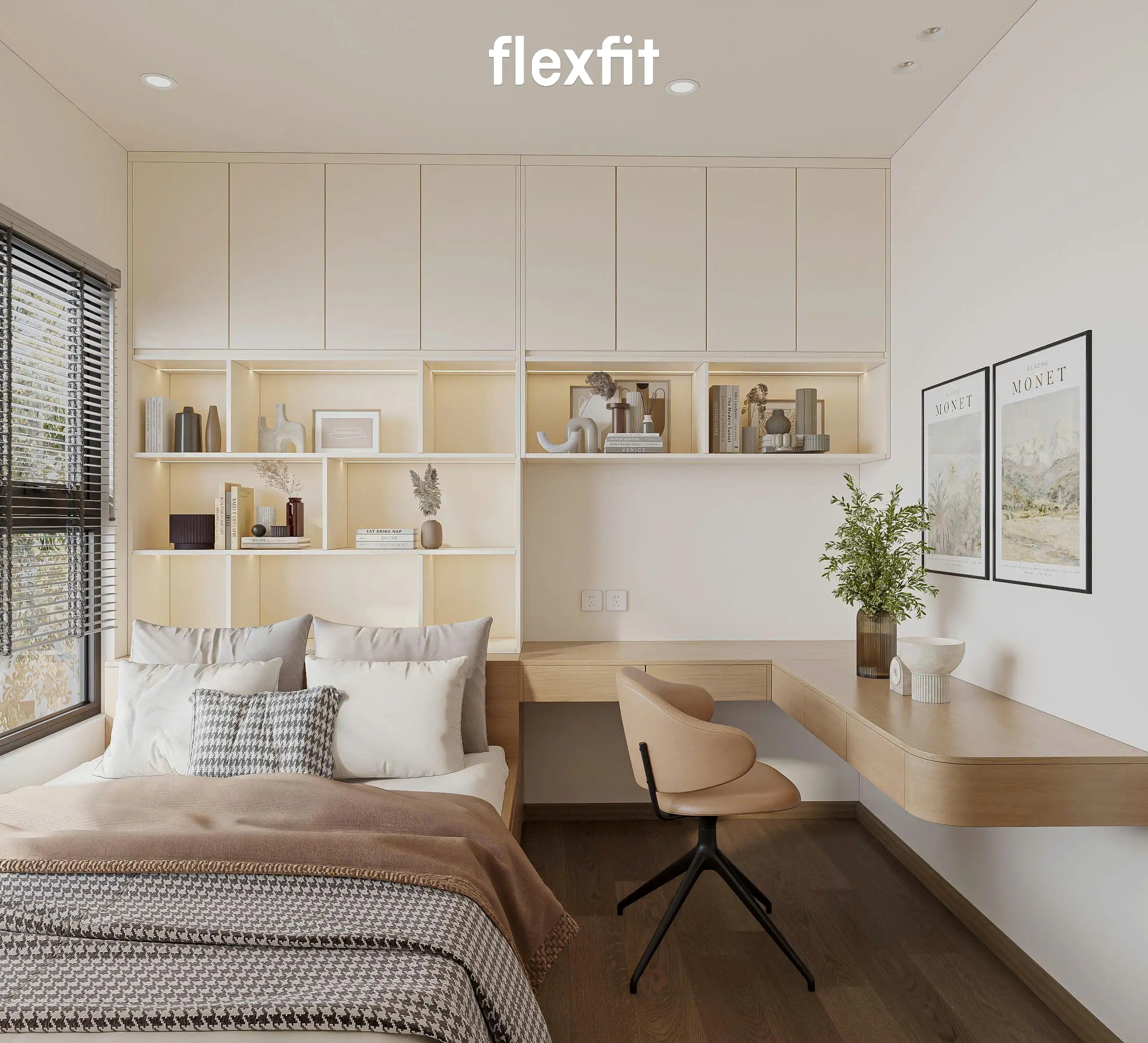 - Điểm nhấn: Sơn tường hiệu ứng vữa/loang màu cho khu vực quan trọng (tường TV/đầu giường) và sử dụng các vật liệu thô mộc.