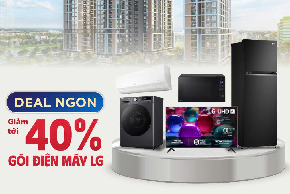 - Giảm tới 40% khi mua sắm các sản phẩm điện máy LG, giúp căn hộ của bạn trở nên hiện đại, đầy đủ tiện nghi ngay lập tức.