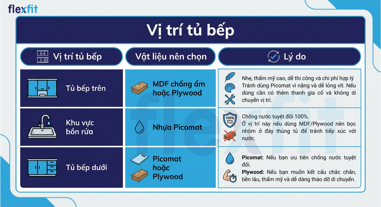 Dựa trên kinh nghiệm thi công hàng trăm bộ tủ bếp mỗi năm, Flexfit đưa ra các lưu ý quan trọng sau: