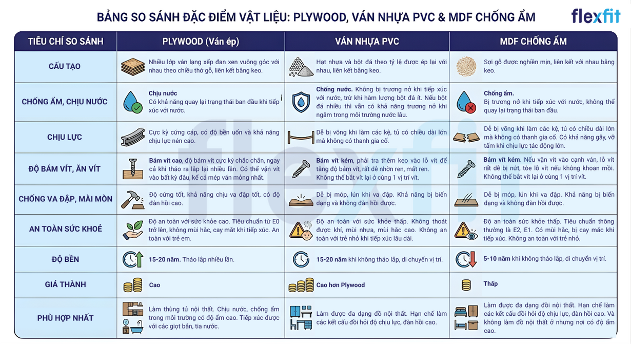 Trong bối cảnh đó, MDF lõi xanh chống ẩm, Picomat (Nhựa PVC) và Plywood (ván ép) là ba ứng viên được lựa chọn nhiều nhất vì đáp ứng khá đầy đủ những tiêu chí trên. Tuy nhiên, mỗi loại lại phù hợp với từng vị trí khác nhau và sẽ phát huy tối đa hiệu quả nếu dùng đúng.